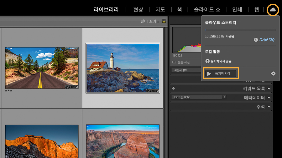 Lightroom Classic의 오른쪽 상단 클라우드 동기화 아이콘을 클릭한 다음 동기화 시작 을 클릭합니다.