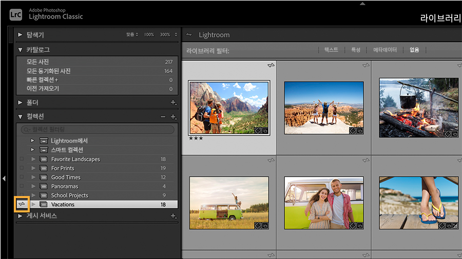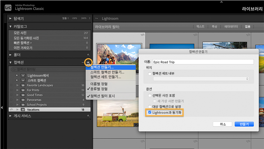 동기화할 사진의 기존 컬렉션 또는 새 컬렉션을 표시하여 데스크탑용 Lightroom Classic에서 동기화되는 사진을 관리할 수 있습니다. 동기화할 이미지는 컬렉션에 포함되어야 합니다.