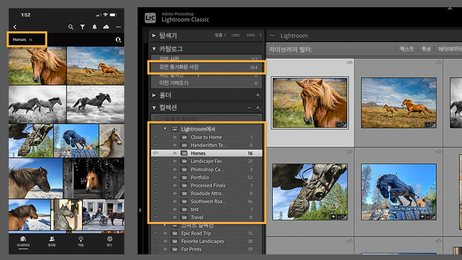 데스크탑용 Adobe Lightroom Classic 컬렉션을 모바일 및 웹용 Lightroom 에코시스템과 동기화하는 방법을 살펴보세요.