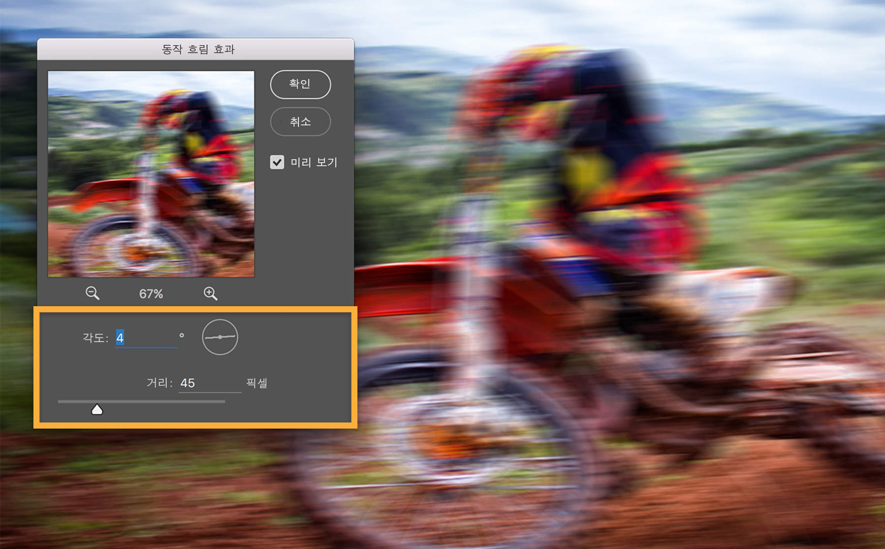 한 방향으로 흐르는 흐림 효과를 추가하여 속도감을 표현할 수 있습니다. 필터 > 흐림 효과 > 동작 흐림 효과를 선택하고 개체의 동작 방향에 맞게 각도를 조정합니다. 거리 설정을 사용하여 흐림 효과 양을 제어합니다.