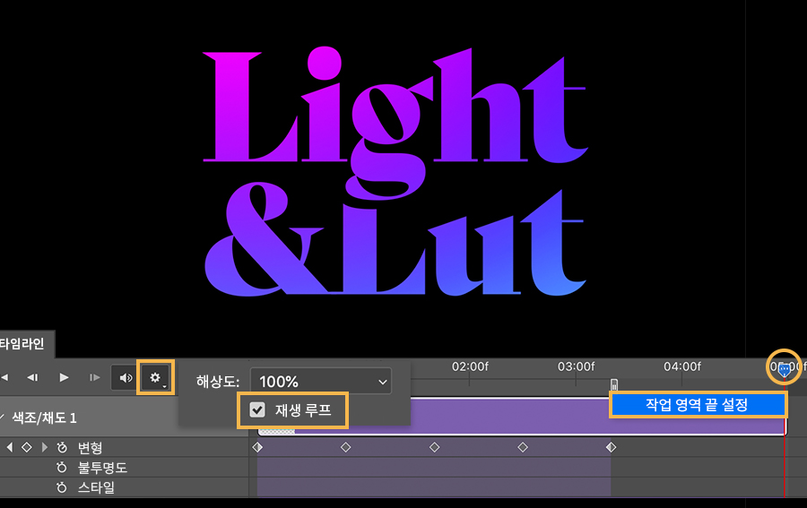 마지막 위치에서 재생 헤드를 마우스 오른쪽 버튼으로 클릭하고 작업 영역 끝 설정을 선택하여 애니메이션 구간을 정의합니다. 톱니바퀴 아이콘을 클릭하고 재생 루프를 체크 표시하여 반복 효과를 만든 다음 재생을 클릭하여 애니메이션을 테스트합니다.