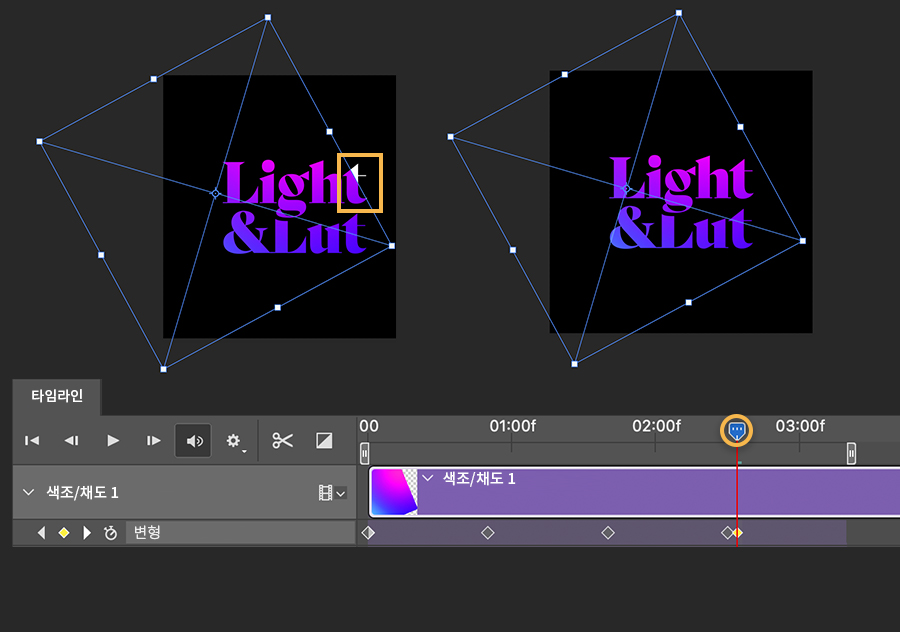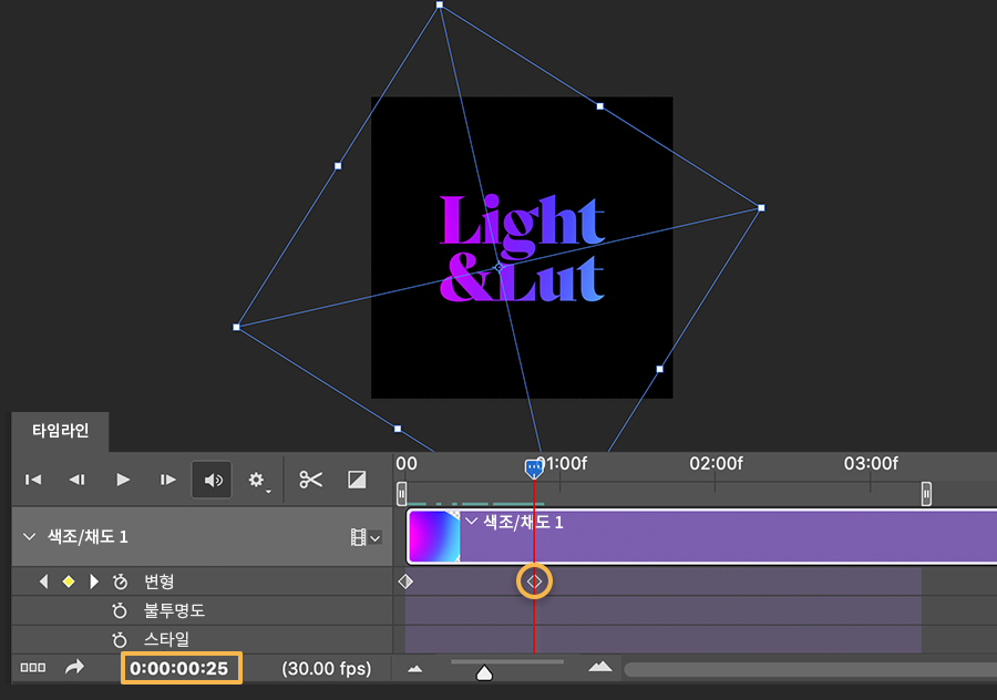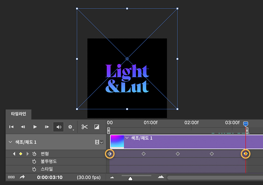텍스트를 채우는 그레이디언트 색상을 변형하여 애니메이션을 적용합니다. 시작하려면 Ctrl+T(Windows) 또는 Command+T(macOS)를 누른 상태에서 그레이디언트의 크기와 위치를 조정하고 Enter/Return을 눌러 변경 사항을 적용합니다. 타임라인의 색조/채도 레이어 옆에 있는 드롭다운 화살표를 클릭하고 변형 속성 옆에 있는 초시계를 클릭하여 애니메이션의 첫 번째 키프레임을 설정합니다.