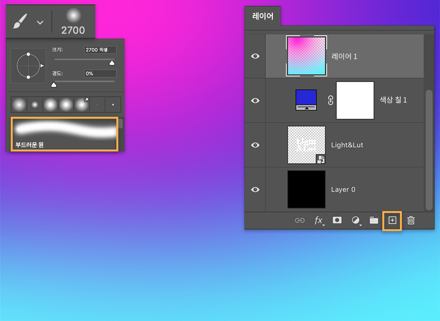 새 레이어를 추가하고 부드러운 원 브러시(B)를 선택한 다음 분홍색(#ff25de)으로 설정하고 모퉁이를 큰 색상 견본으로 칠합니다. 세 번째로 청록색(#4befff)을 추가하여 그레이디언트를 자유롭게 만듭니다.