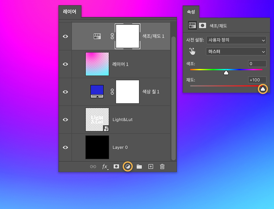 그레이디언트의 색상을 보정하기 위해 색조/채도 조정 레이어를 적용하고 채도를 높입니다.