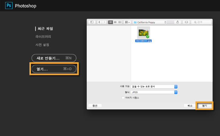 샘플 파일을 다운로드한 다음 압축을 풀거나 보유한 컬러 사진을 사용합니다. Photoshop의 시작 화면에서 열기 버튼을 클릭하거나 파일 > 열기 를 선택합니다. 그런 다음 사진을 찾고 열기 를 클릭합니다.