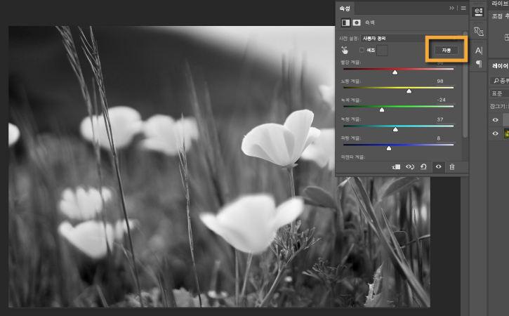 새로운 흑백 조정 레이어가 레이어 패널에 표시되고 아래 레이어에 있는 사진이 흑백으로 변경됩니다.