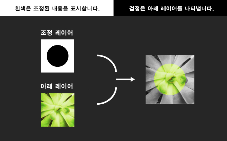 이 조정된 내용은 레이어 마스크가 흰색인 영역에 표시되고 레이어 마스크가 검정인 영역에서는 숨겨지므로 원본 색상이 이 검정 영역을 통해 보여집니다. 다음 단계에서 레이어 마스크에 검정을 추가하고 이미지의 일부 영역에 색상을 다시 되살려 봅니다.