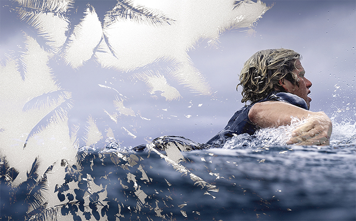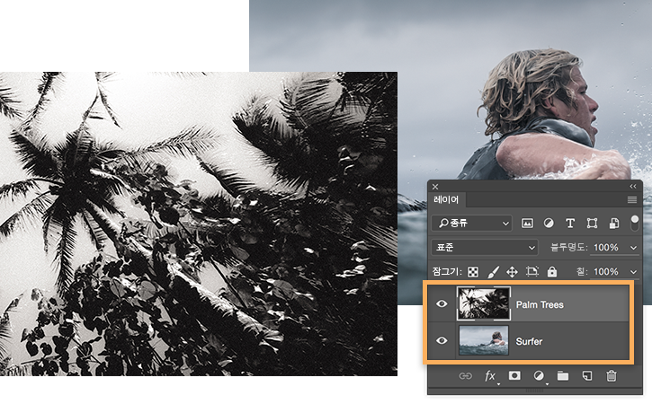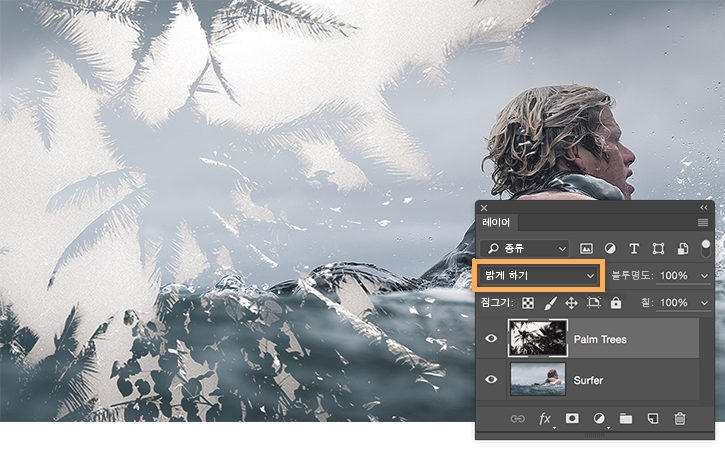 이 예제의 경우 밝게 하기 모드를 적용한 결과 서퍼 이미지가 야자수 나무의 어두운 부분을 통해서 보여집니다. 각 모드는 다른 효과를 제공하므로 다양한 모드를 적용해 보면서 원하는 효과를 찾아보세요.