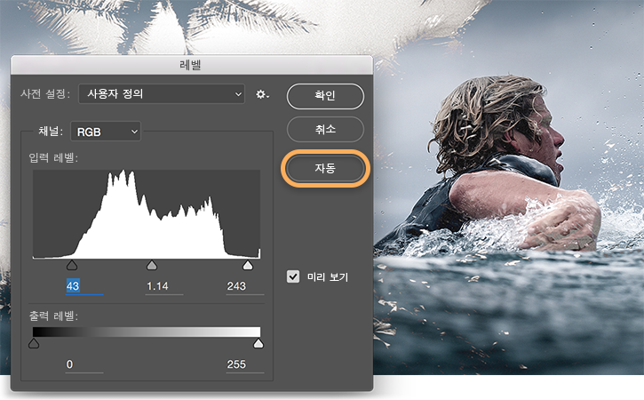 레벨 대화 상자에서 자동을 선택합니다. 이미지의 어두운 영역과 밝은 영역은 자동으로 조정되고 이미지의 대비가 더욱 뚜렷해집니다. 입력/출력 슬라이더를 사용하여 세부적으로 조정합니다. 효과를 적용한 결과가 마음에 들면 확인을 클릭하여 조정을 적용합니다.