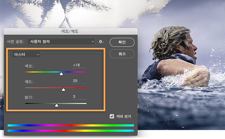 색조, 채도 및 밝기 슬라이더를 사용하여 원하는 대로 이미지를 생동감 있게 조정합니다. 완료하면 확인을 누릅니다.