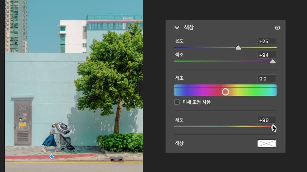 온도 +25, 색조 +94, 채도 +96 조정으로 이미지 안에 숨어있던 포인트 컬러 추가할 수 있습니다.