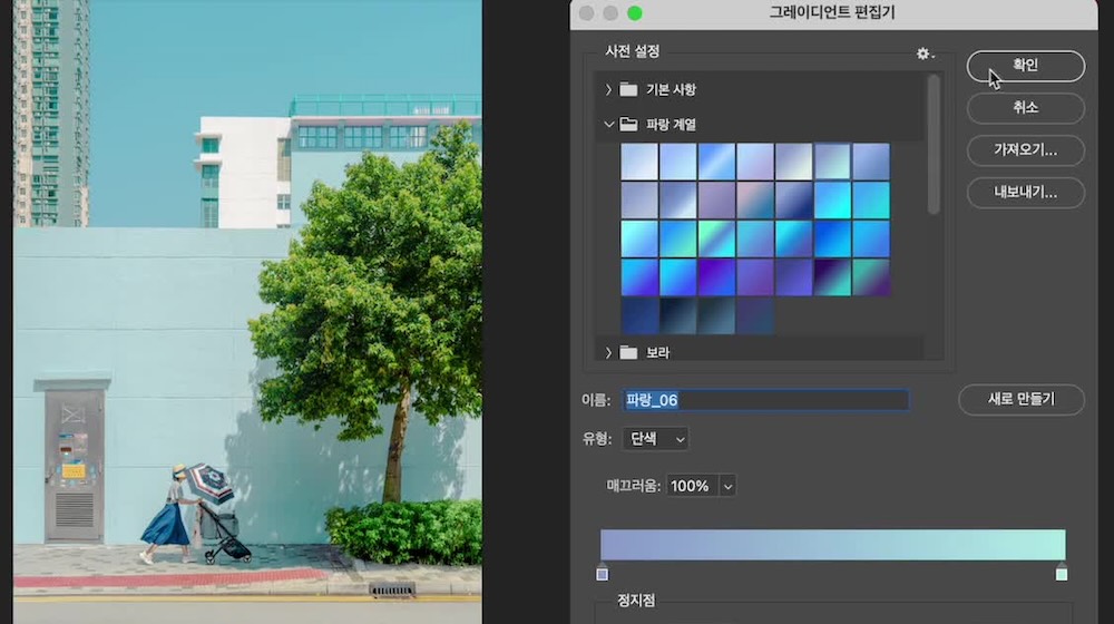 속성창에서 그라데이션 창을 선택해 그레이디언트 편집기 창을 열어주고, 사전 설정 파랑 계열에서 6번째 컬러를 선택 후 확인을 눌러주세요.