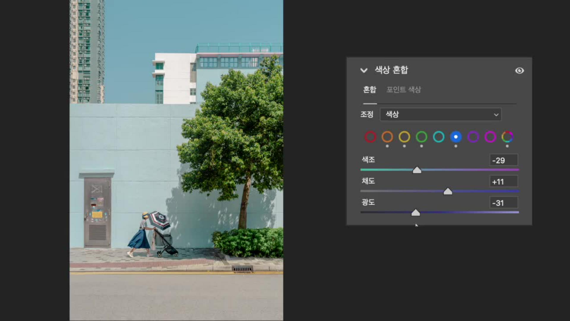 파랑은 색조 -29, 채도 +11, 광도 -31,