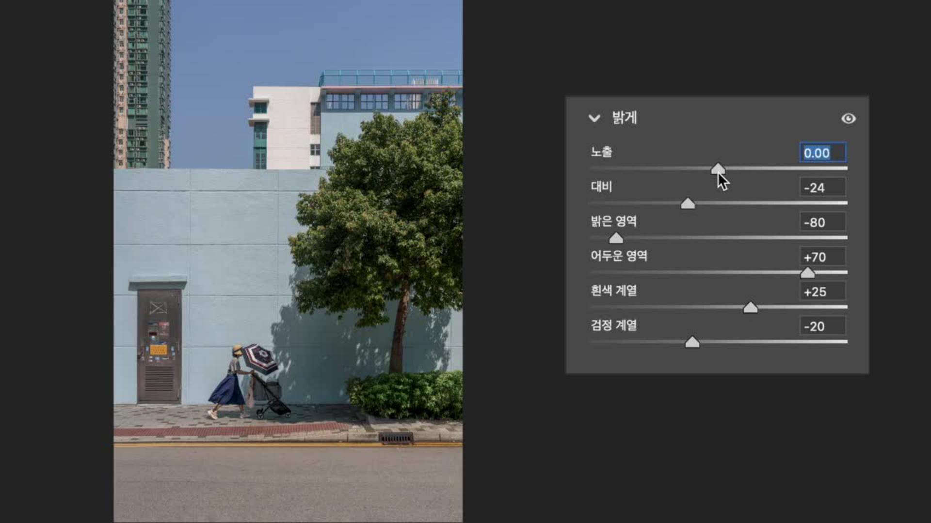 이 조정 적용으로 도시 사진의 분위기가 한결 가벼워집니다.