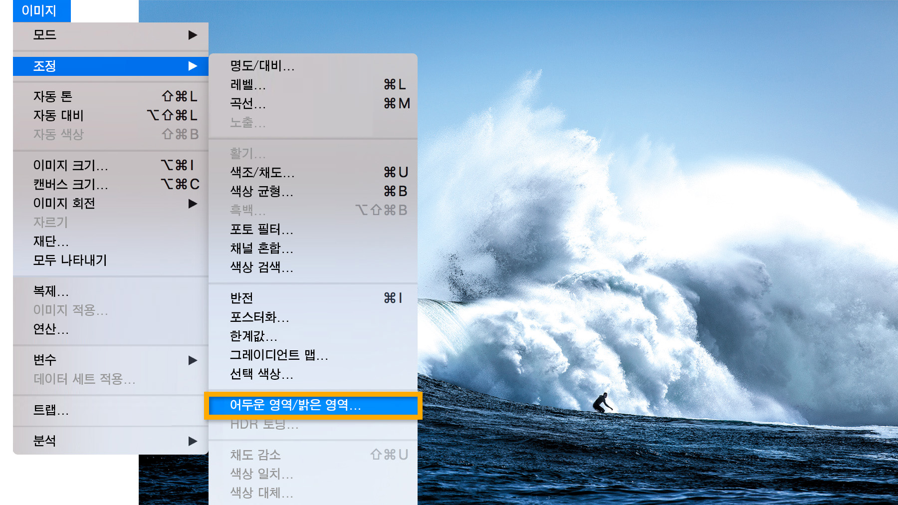 어두운 영역/밝은 영역 조정 레이어를 적용하여 이미지에서 노출이 과하거나 부족한 영역을 조정할 수 있습니다. 이미지 > 조정 > 어두운 영역/밝은 영역을 선택하여 해당 설정을 엽니다.