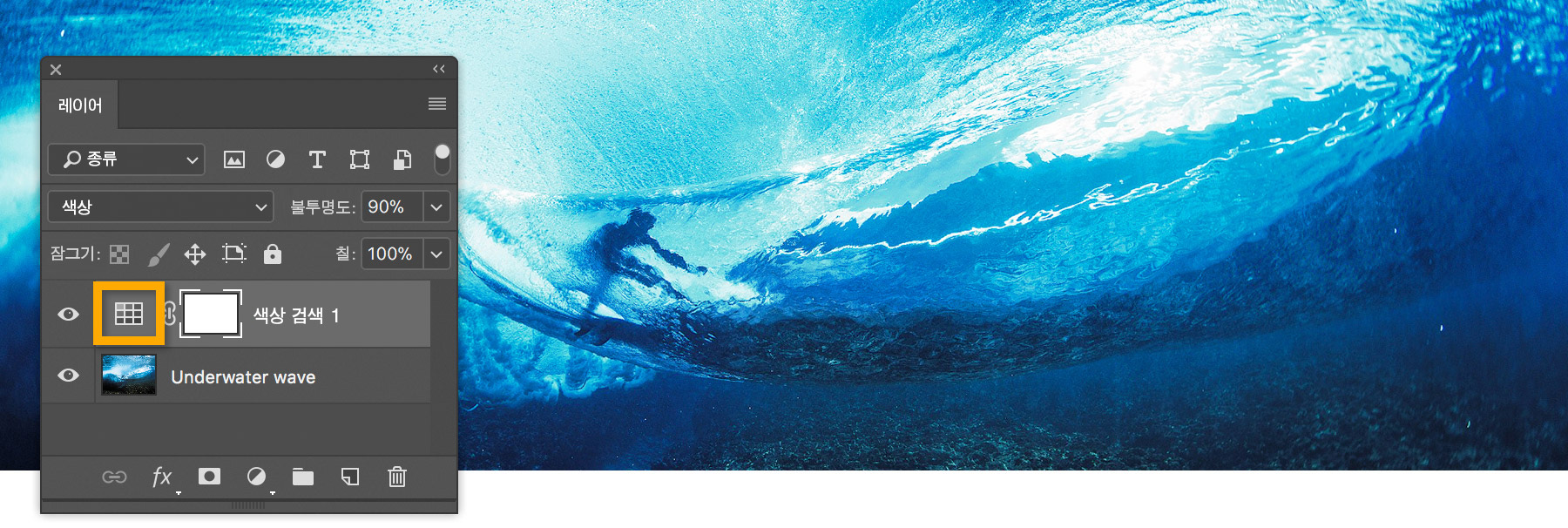 색상 검색 설정을 조정하려면 레이어 패널에서 색상 검색 레이어 옆에 있는 아이콘을 두 번 클릭합니다.