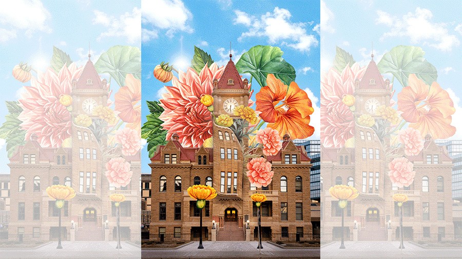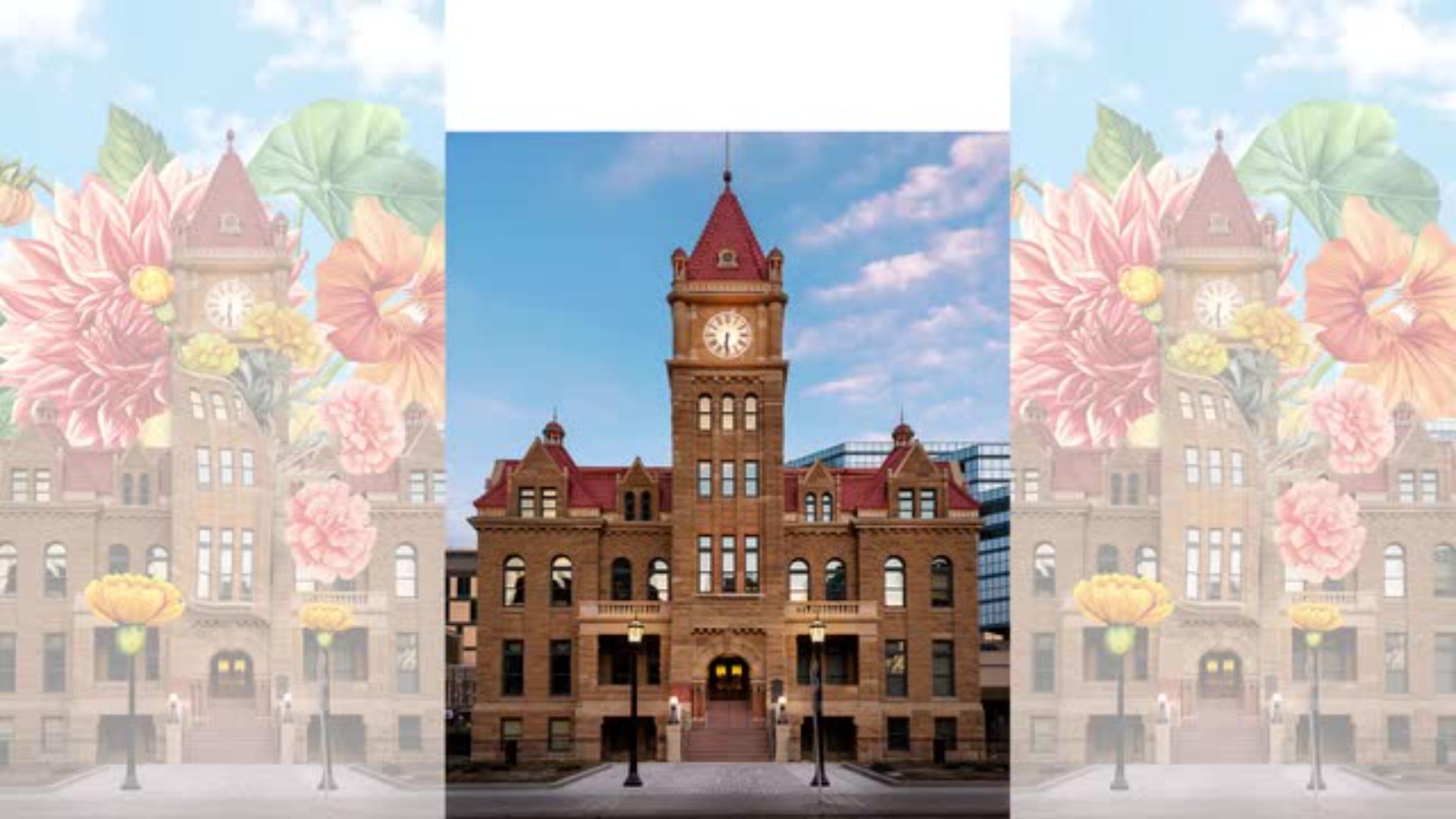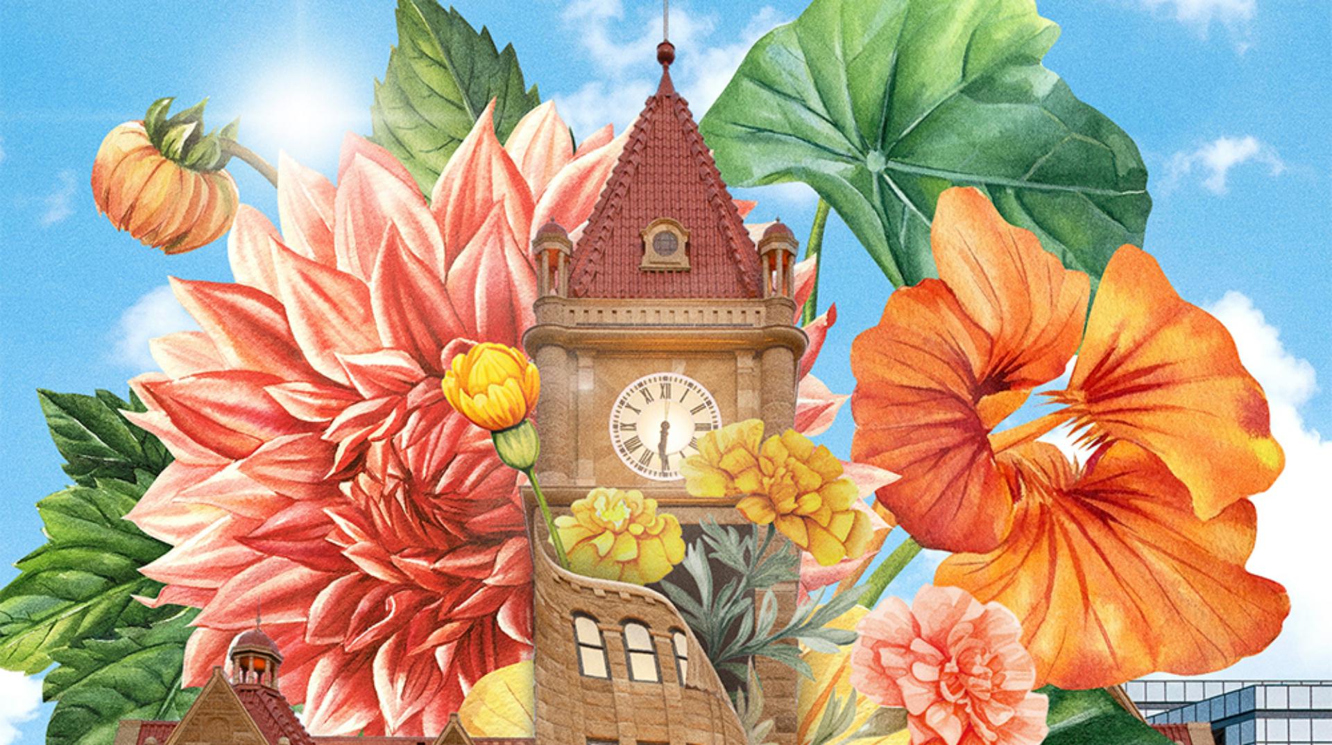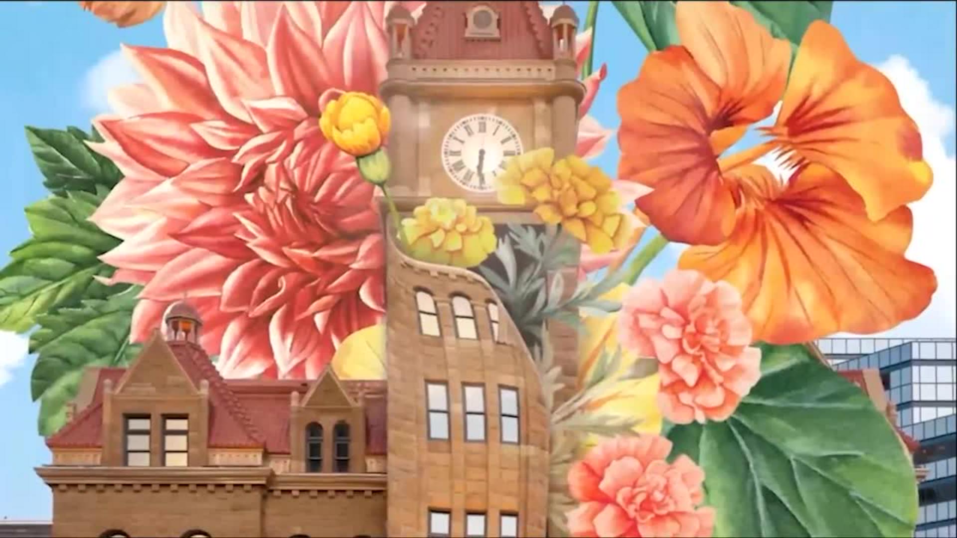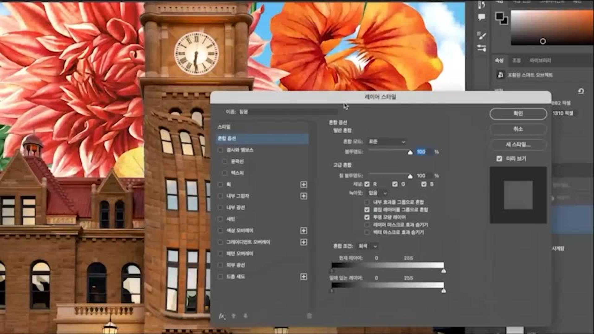 이제 새로운 꽃 사진과 하늘 이미지를 불러와 시계탑 위에 배치합니다.