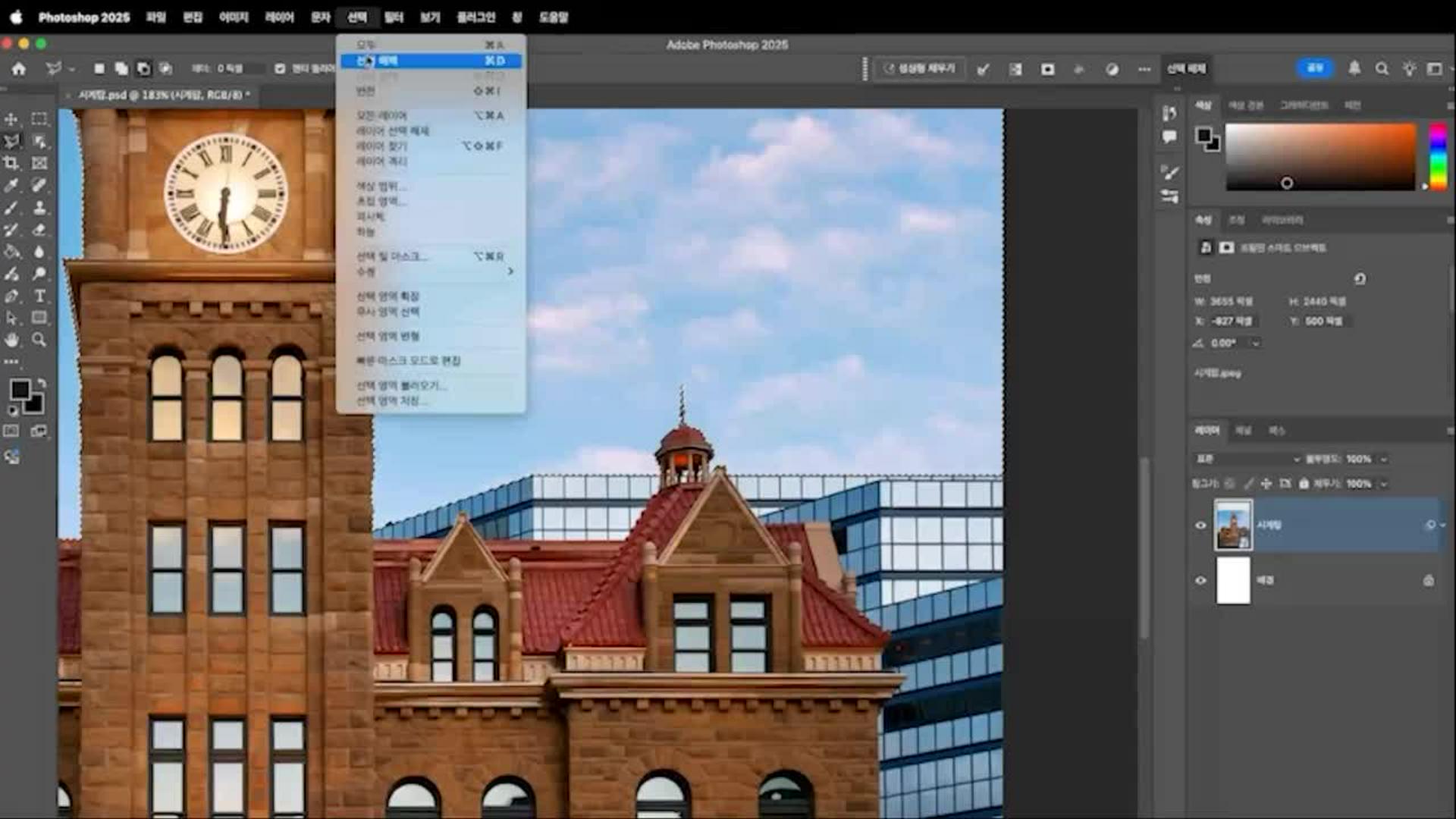 사진이 선택된 상태에서 선택 > 하늘을 눌러 하늘 부분을 지정합니다.