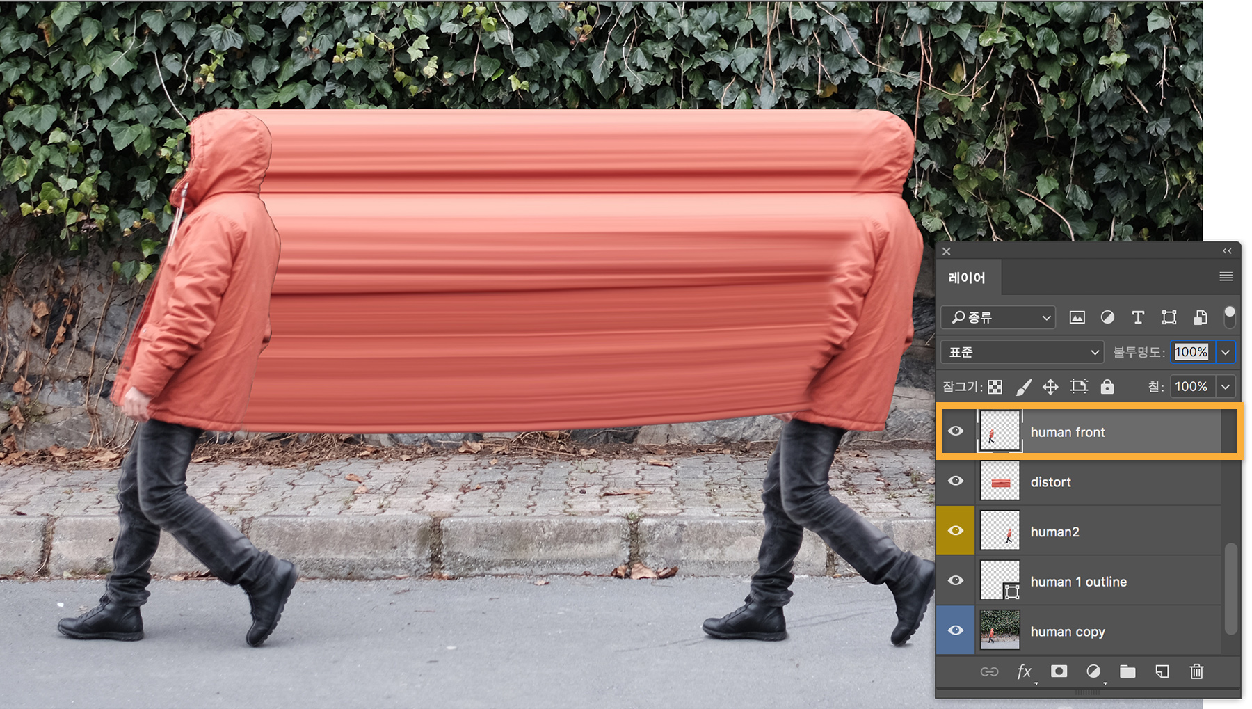 이미지의 각 부분은 개별적으로 효과를 적용할 수 있도록 별도의 레이어로 분리되어 있습니다. 이제 앞쪽에 있는 인물의 재킷에 왜곡을 추가합니다. 먼저 앞쪽의 인물을 새 레이어에 복제합니다. 그런 다음 이 인물 레이어를 늘어난 재킷이 들어 있는 레이어 위에 배치합니다.