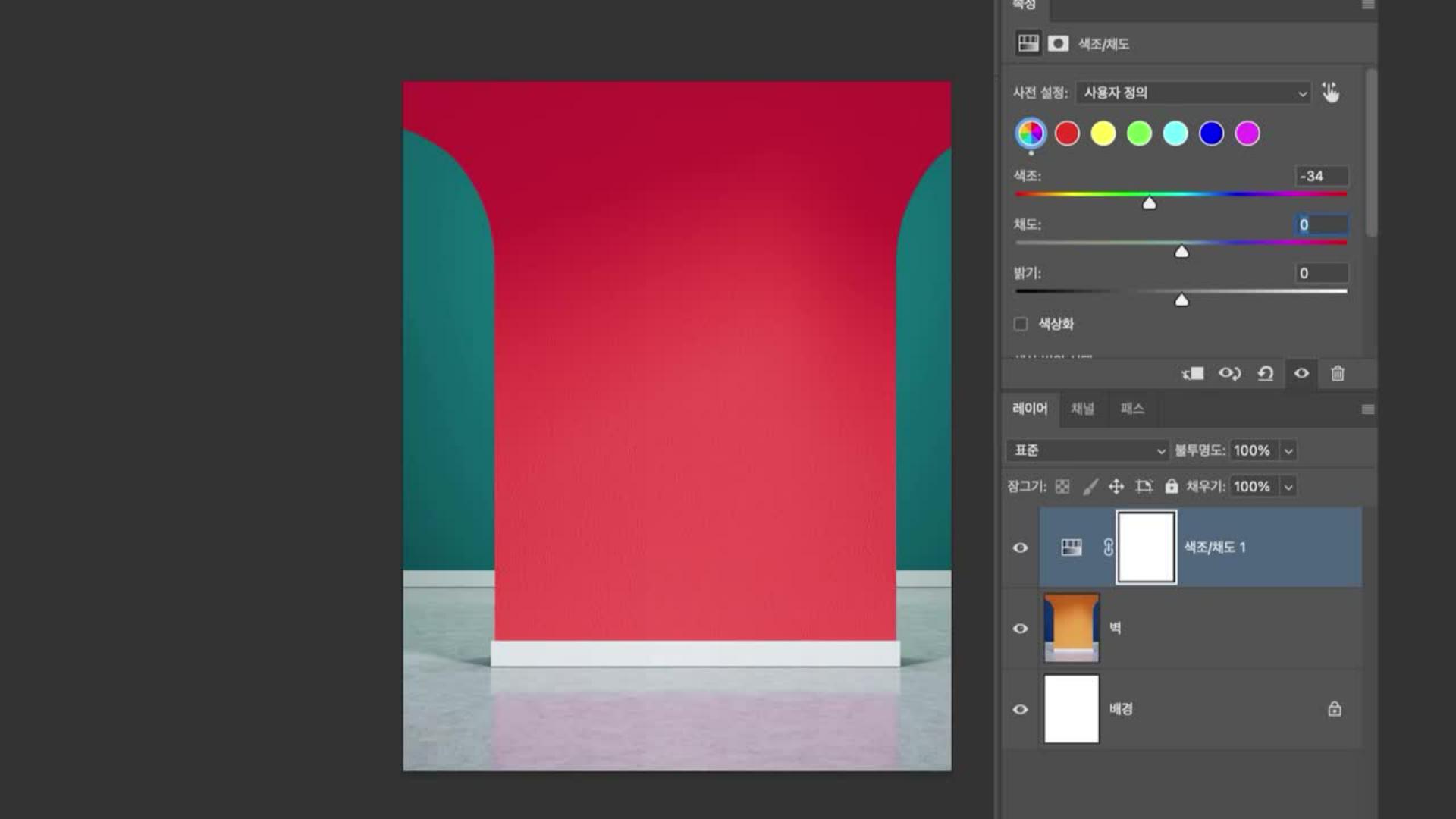 기본 배경 이미지를 불러온 뒤 레이어 > 새 조정 레이어 > 색조/채도... 를 적용합니다.