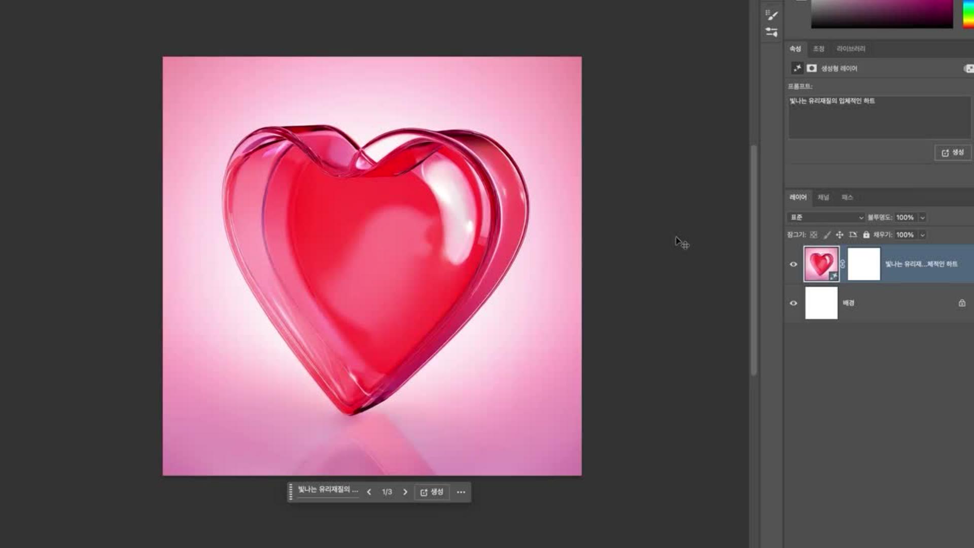 AI 프롬프트 입력: “빛나는 유리재질의 입체적인 하트”로 투명한 하트를 생성