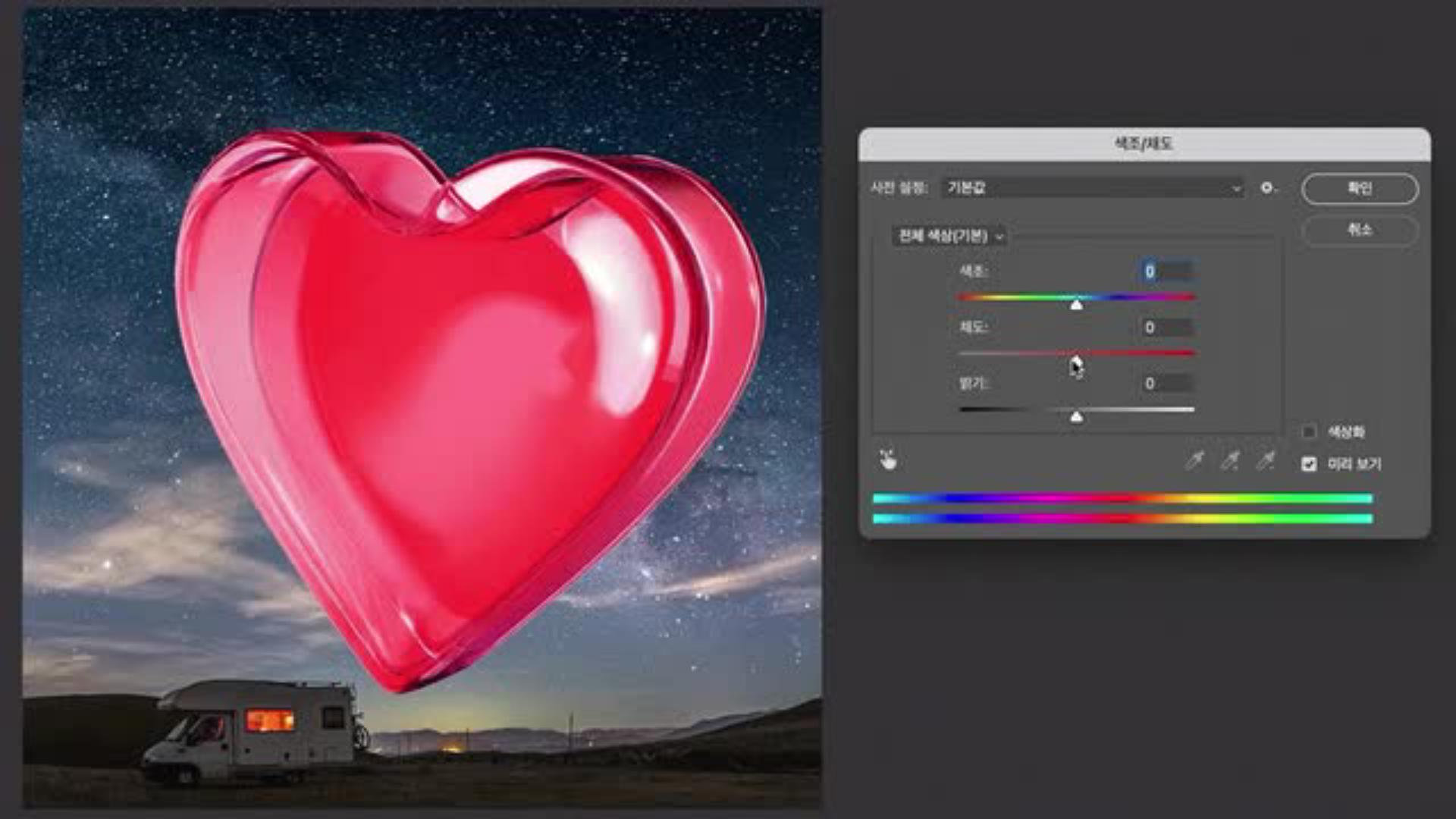 색조/채도 조정으로 원하는 색감 표현 후 하트 안에 자연스럽게 배치