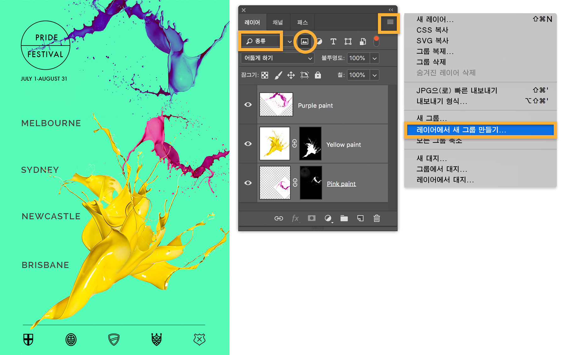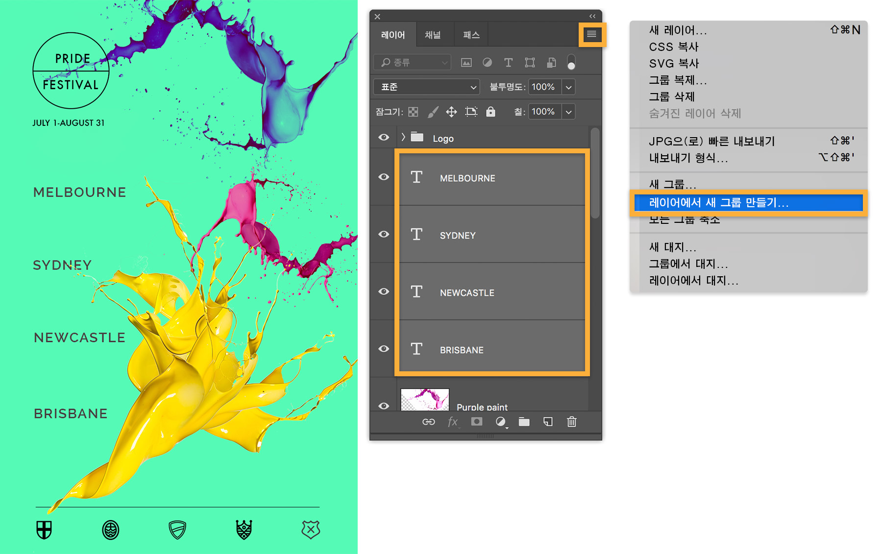 도시 이름을 포함한 네 개의 문자 레이어(Melbourne, Sydney, Newcastle, Brisbane)를 선택합니다. 레이어 패널 메뉴를 클릭하고 레이어에서 새 그룹 만들기를 선택한 다음 그룹 이름을 Cities 라고 입력합니다.