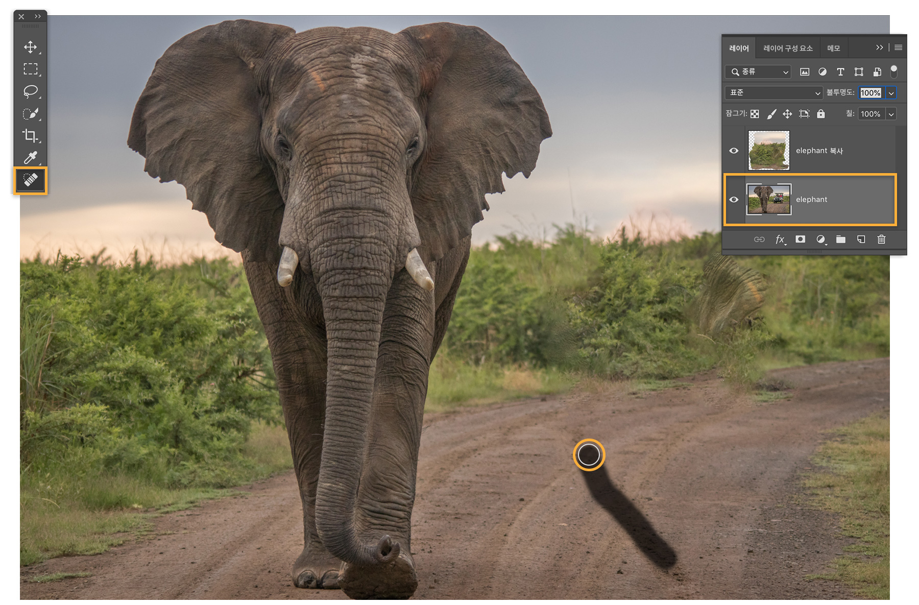 선택 영역이 새 레이어에 출력되므로 원본을 그대로 유지하면서 편집할 수 있습니다. 따라서 원본 이미지는 별도의 레이어에 남아있게 됩니다. 스팟 복구 브러시를 사용하여 도로의 바퀴 자국과 같은 불필요한 요소를 제거합니다. 브러시를 선택하기 전에 레이어 패널(창 > 레이어)에서 원본 레이어를 선택한 다음 없애려는 영역을 브러시로 칠해야 합니다.
