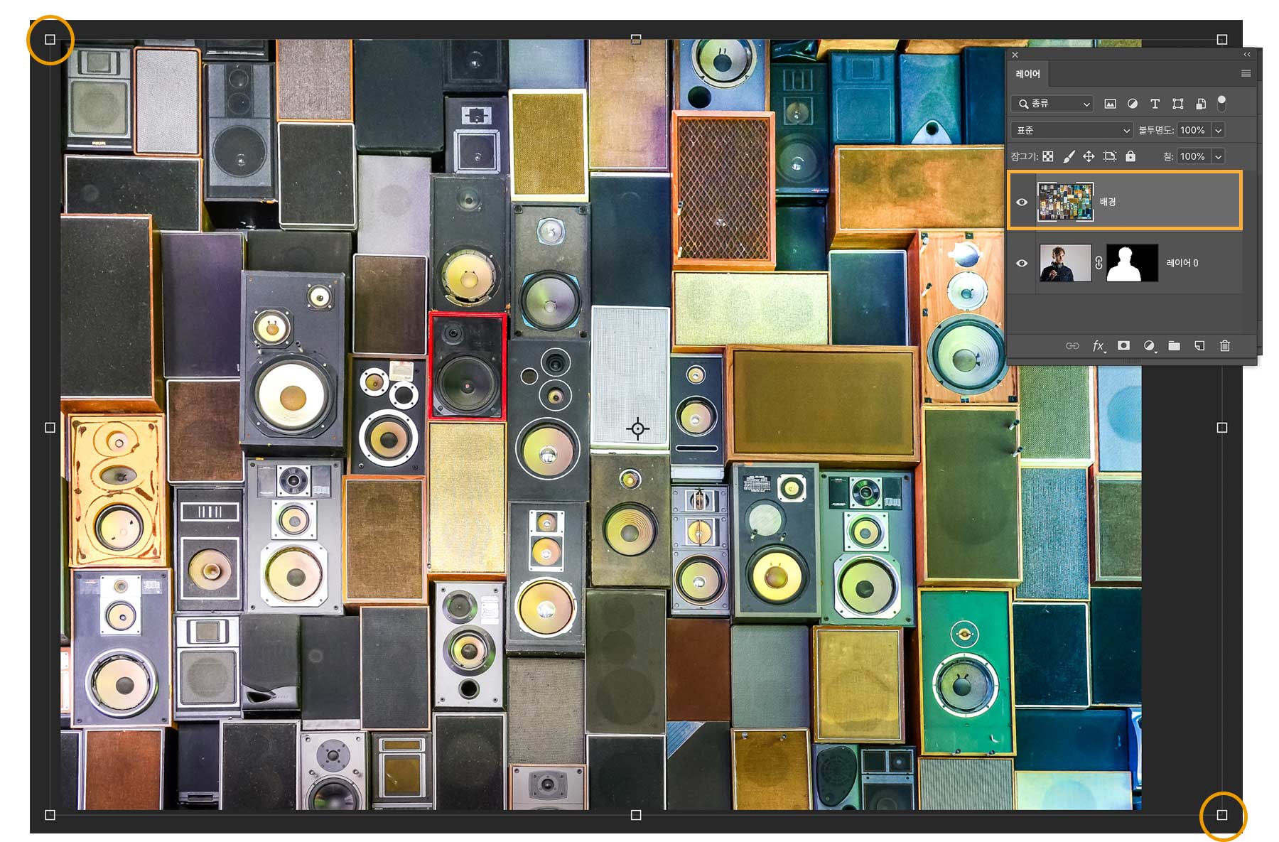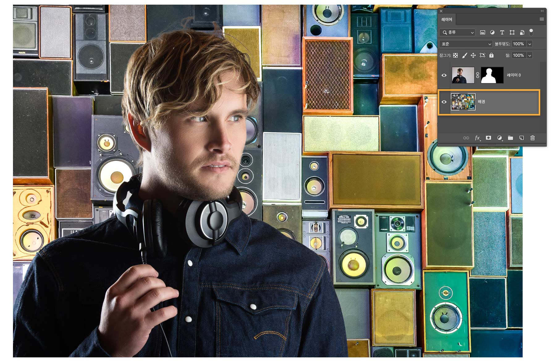 선택 영역을 레이어 마스크에 출력했으므로 레이어 패널(창 > 레이어)에 새 레이어가 생성되었습니다. 새 레이어에 흑백 마스크 축소판이 표시됩니다. 마스크의 흰색 영역은 레이어의 가시적인 영역 즉, 선택 및 마스크 작업 영역에서 방금 만든 선택 영역을 나타냅니다. 검정 영역은 숨겨집니다. 컴퓨터에 실습용 파일로 저장한 스피커 이미지를 Photoshop으로 드래그합니다. 핸들을 드래그하여 이미지 크기를 조정하고 Enter 또는 Return을 눌러 배치합니다. DJ 레이어 아래로 새롭게 추가된 스피커 이미지를 이동합니다.