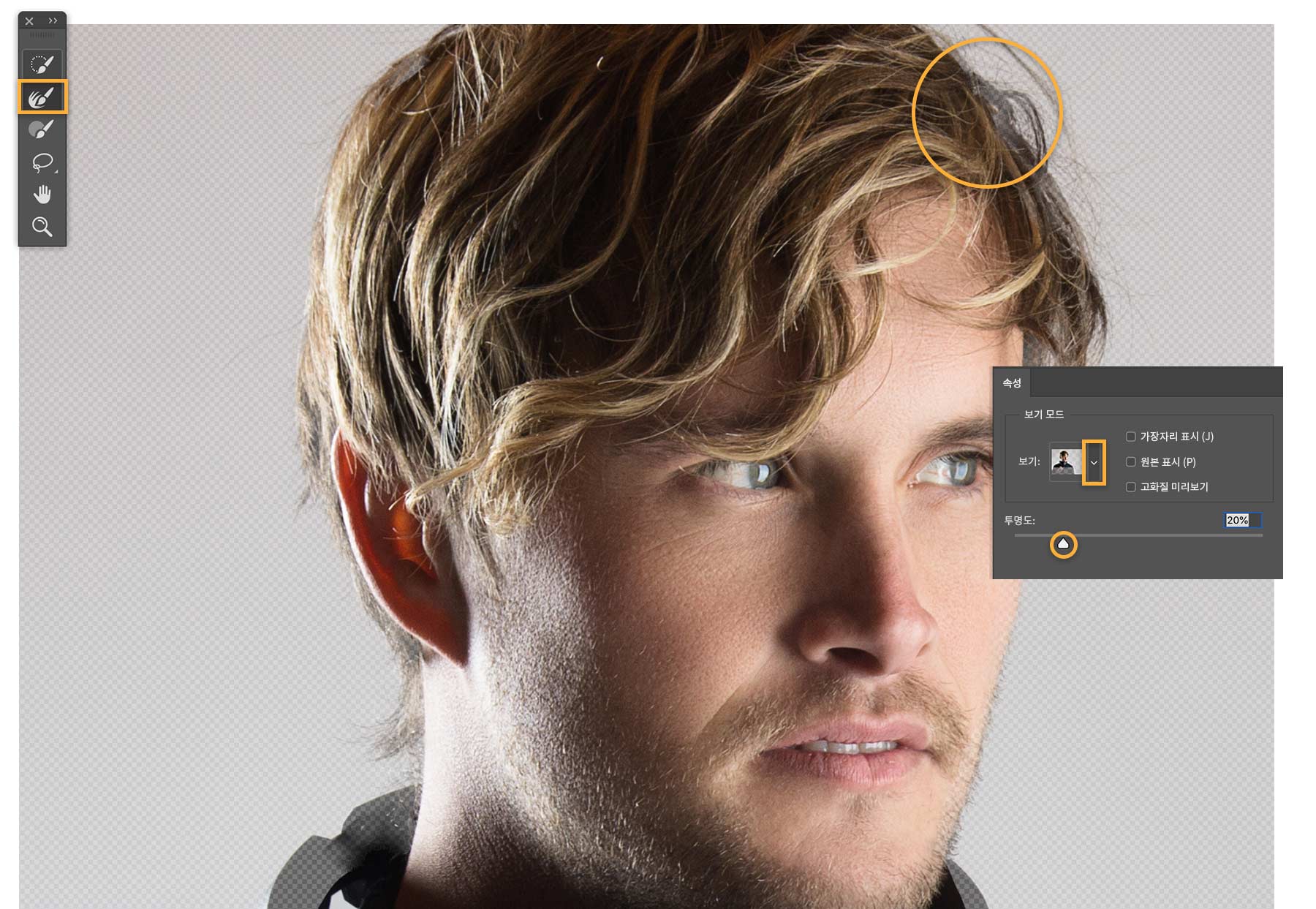 선택 및 마스크 작업 영역에는 선택 영역 가장자리를 볼 수 있는 다양한 보기 모드가 있습니다. 예제에서는 어니언 스킨 모드를 사용하고 투명도 설정을 조정하여 선택 영역에 추가할 영역이 잘 보이도록 했습니다. 가장자리 다듬기 브러시를 선택한 다음 피사체의 가장자리를 따라 브러시로 칠합니다. 브러시로 칠하면 흐릿해 보이는 가장자리가 선택 영역에 포함됩니다.