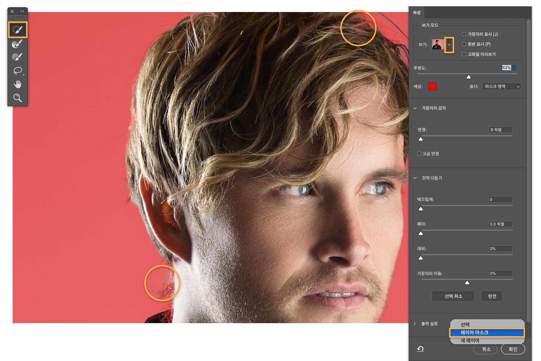가장자리 다듬기 브러시는 처음 시작 단계에 사용하기 좋습니다. 원하는 모든 영역을 선택하려면 오버레이 보기 모드로 전환합니다. 빨간색 오버레이가 선택 영역에 포함되지 않은 부분 위에 표시됩니다. 아래 이미지를 보면 모델의 머리카락과 헤드폰 일부분이 가장자리 다듬기 브러시로 선택 영역에 포함되지 않은 채 남아 있습니다. 빠른 선택 툴로 전환하고 포함할 해당 영역을 브러시로 칠해 봅니다. 선택이 완료되면 속성 패널 하단에서 출력 위치 > 레이어 마스크를 선택하고 확인을 클릭합니다.