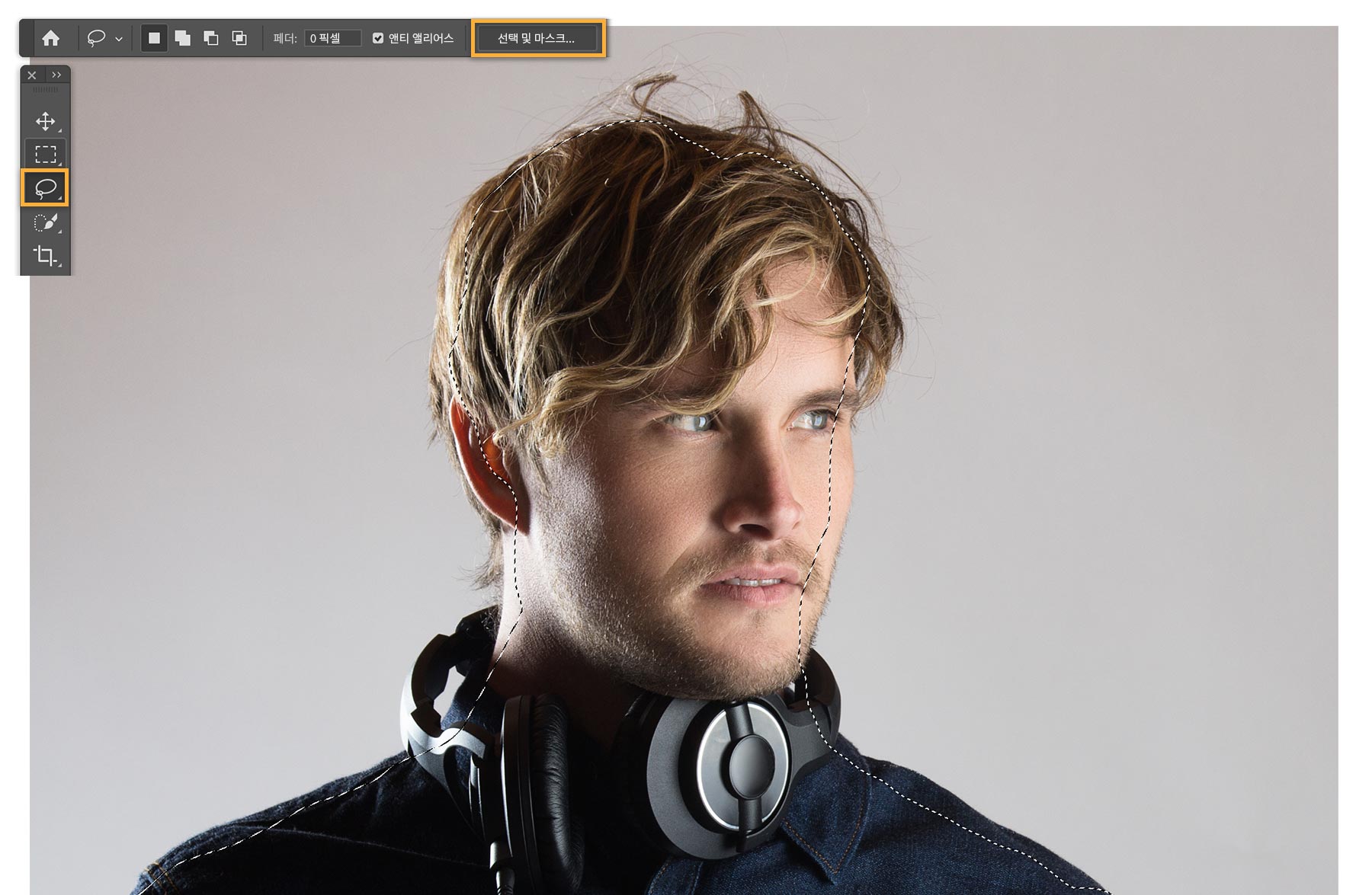 실습용 파일이나 보유한 파일을 사용해 보세요. 먼저 올가미 또는 빠른 선택 툴을 사용하여 첫 선택 영역을 만듭니다. 예제 파일에서는 올가미 툴을 사용하여 선택 영역 바깥쪽에 있는 머리카락 가장자리를 남겼습니다. 이때 선택 영역에 배경의 일부가 포함되지 않도록 합니다. 그런 다음 선택 및 마스크 버튼을 클릭하여 작업 모드가 열리면 나머지 머리카락 선택 영역을 미세하게 조정합니다.