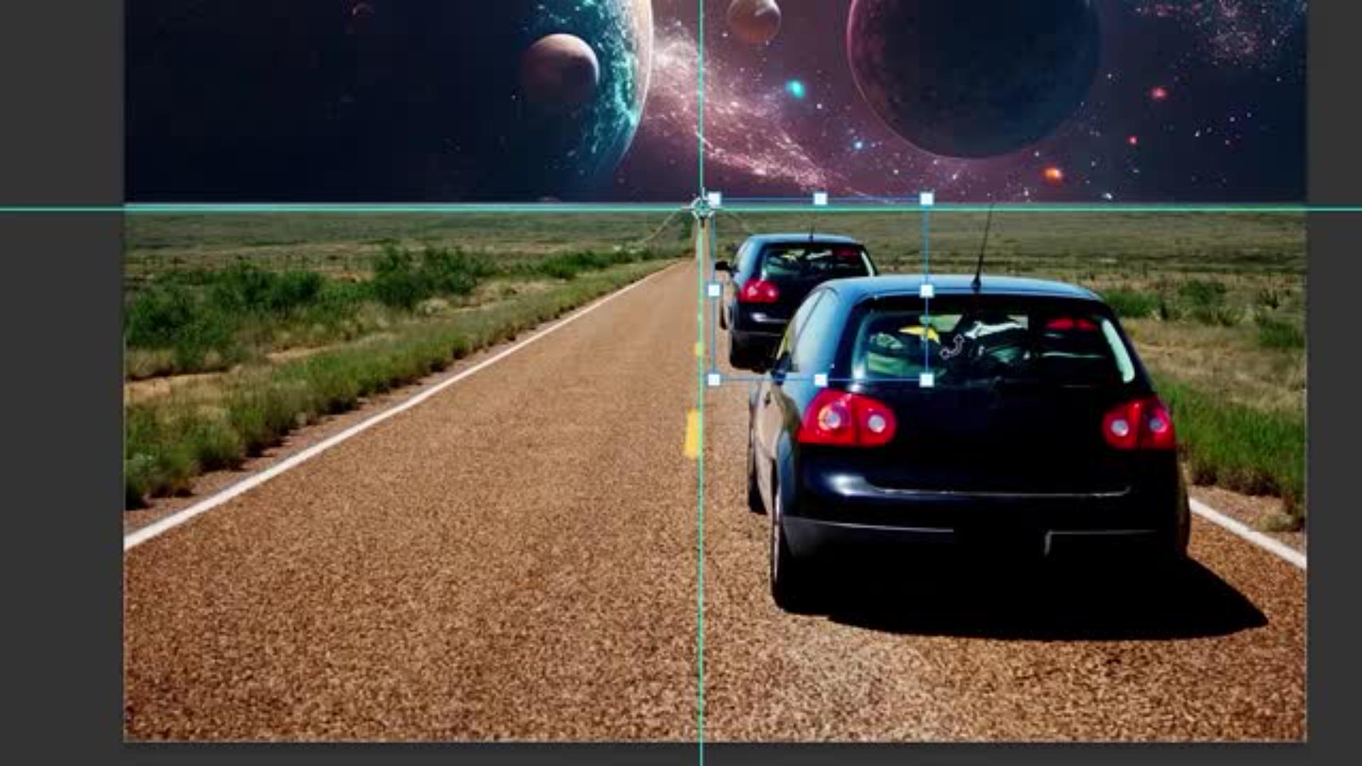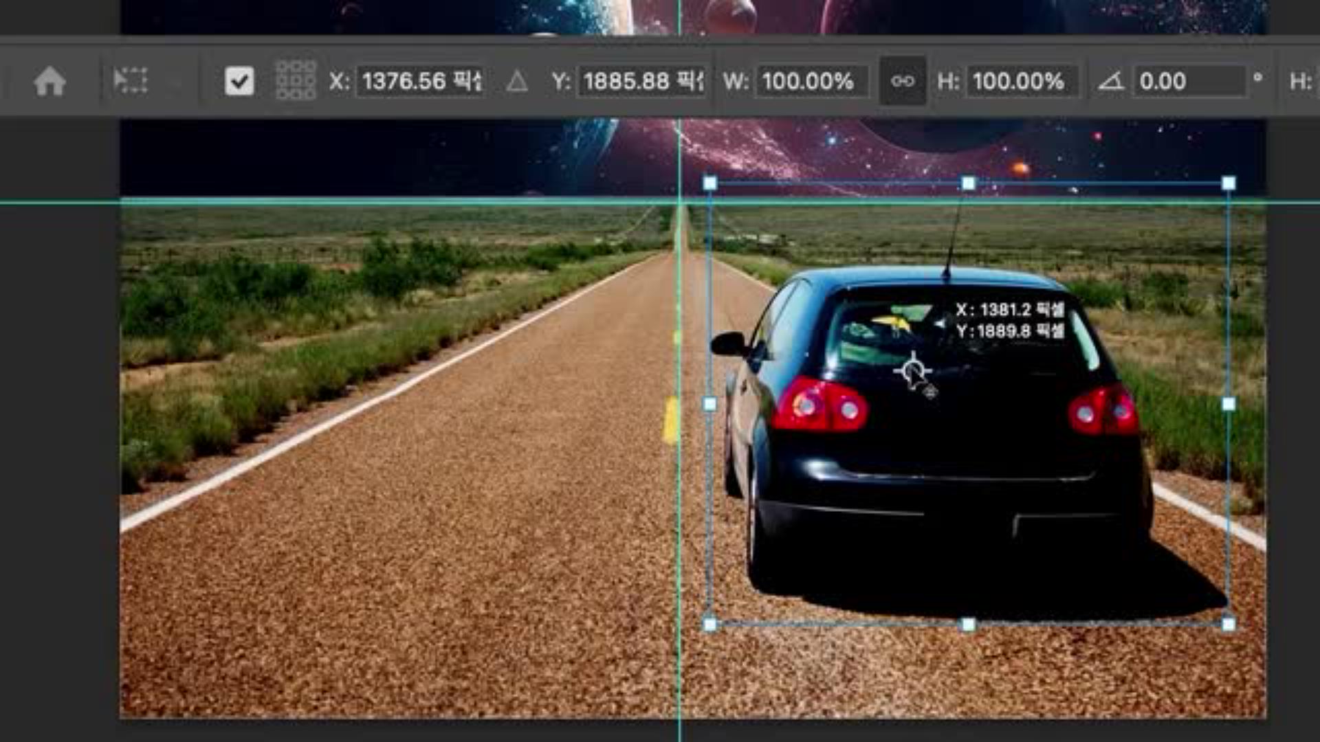 포토샵에서 이미지 파일을 불러옵니다. 우주 이미지와 도로가 포함된 사진을 준비해 포토샵 화면 위에 배치하세요.