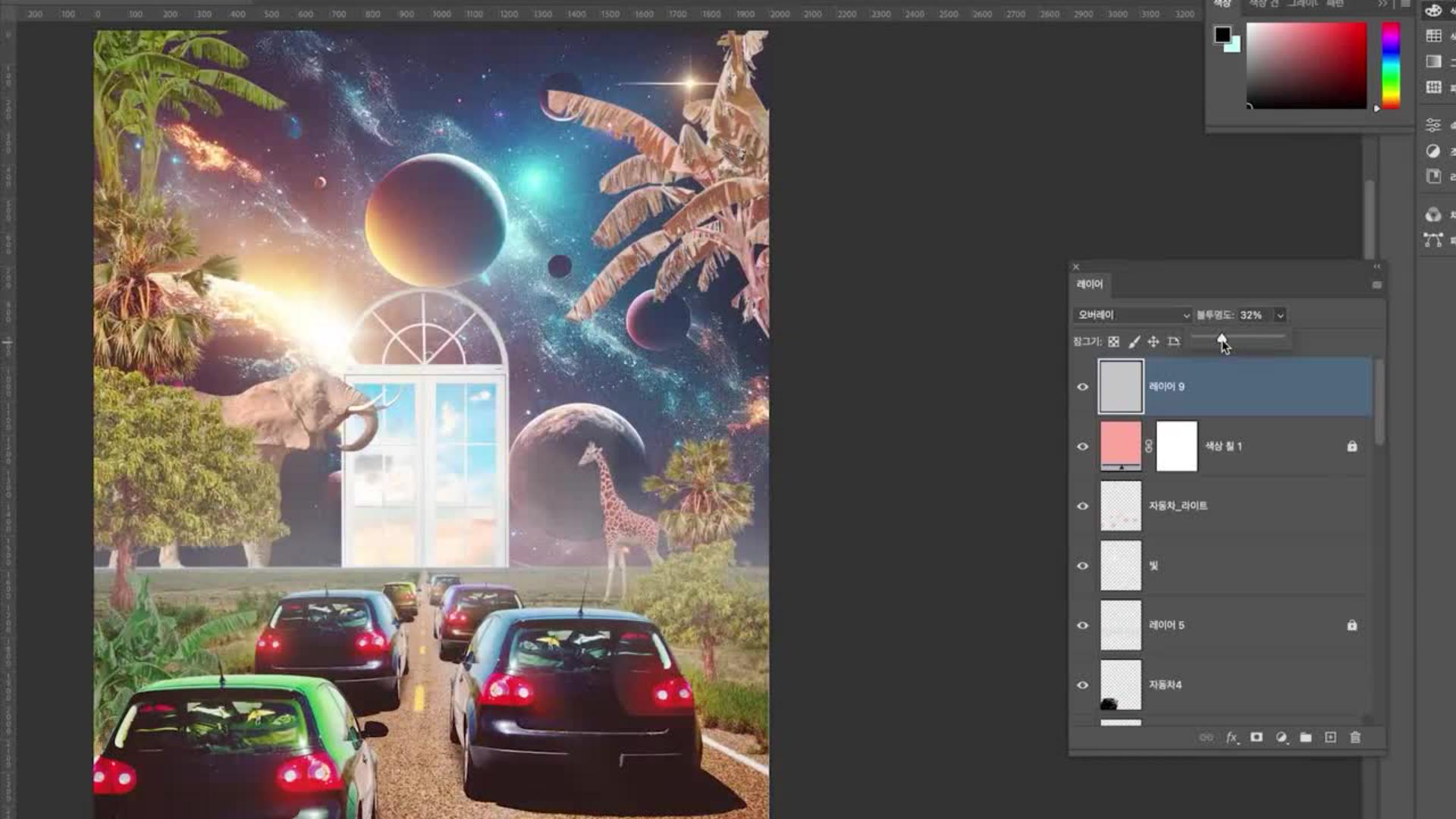 레이어 순서 관리: 자동차, 건물, 배경 레이어 순서를 잘 조정해야 결과물이 깔끔합니다.