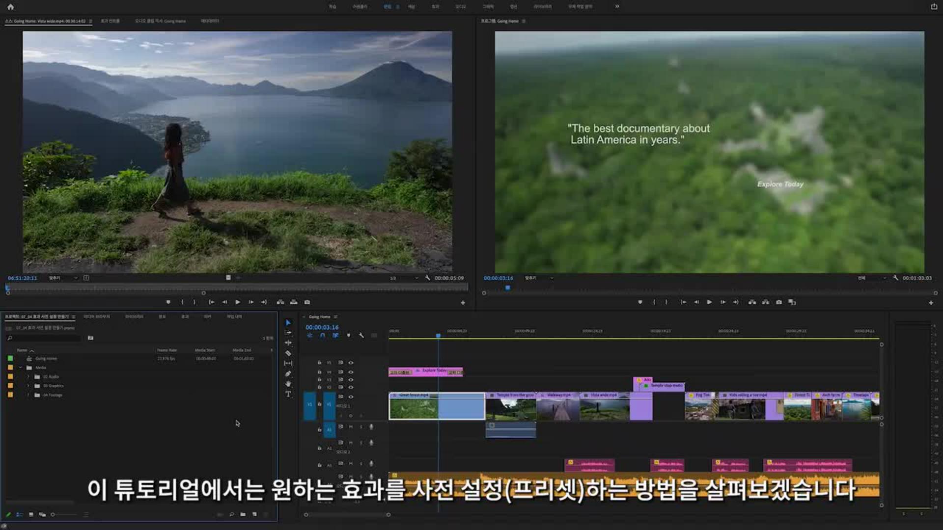 시퀀스에서 하나의 클립을 선택하여 효과 컨트롤 패널에서 효과 설정을 표시하고 변경합니다. 효과마다 컨트롤과 옵션이 다릅니다.