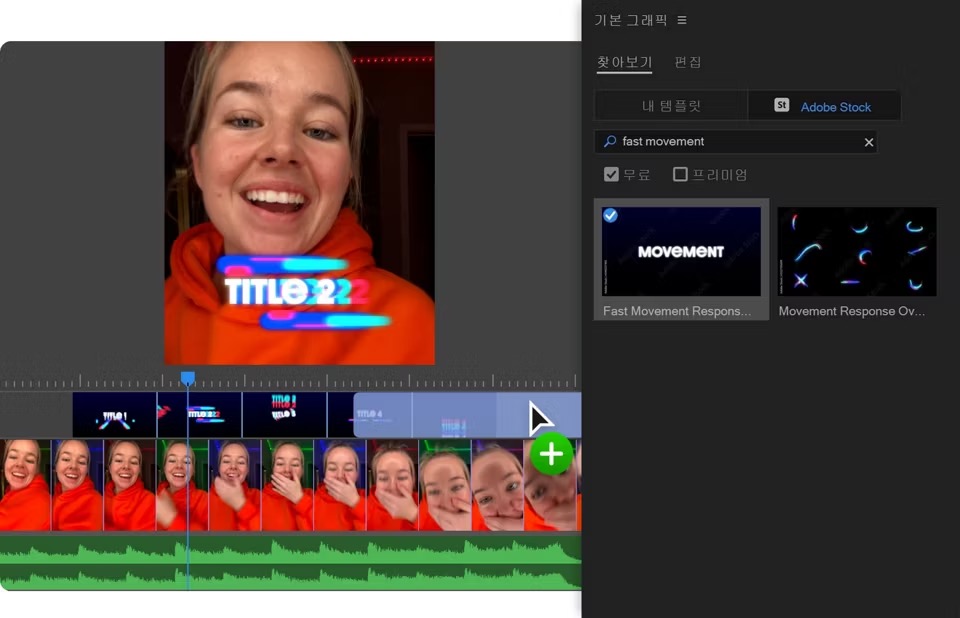 기본 그래픽 패널에서 흥미로운 무료 모션 그래픽 템플릿(mogrts)을 살펴보고 템플릿 하나를 선택한 다음, 타임라인으로 드래그하여 어떤 모양인지 확인해 보세요. Jillian은fast movement 타이틀을 선택했습니다.