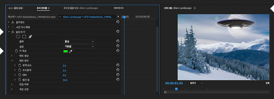 그린 스크린 푸티지에울트라 키 효과 를 적용합니다. 키 색상 스포이드 색상 피커를 클릭한 다음 클립에서 녹색을 샘플링하여 키잉해 보이지 않게 제거하세요. 샘플링하는 동안 Command/Ctrl을 누르면 더 큰 색상 영역을 측정하며, 일반적으로 더 나은 키잉 결과를 얻을 수 있습니다. 푸티지에서 그린 스크린의 고른 정도에 따라 설정을 기본값에서 높음으로 변경하고 키잉된 푸티지를 향상시켜 보세요.