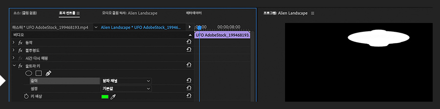 키의 품질을 확인하려면 출력을 합성에서 알파 채널로 변경해 보세요. 키잉된 개체는 흰색(불투명)이어야 하고 배경은 검정(투명)이어야 합니다. 회색 영역이 있는 경우 반투명이 됩니다. 다시 돌아가 울트라 키 설정을 변경하여 제거합니다.
