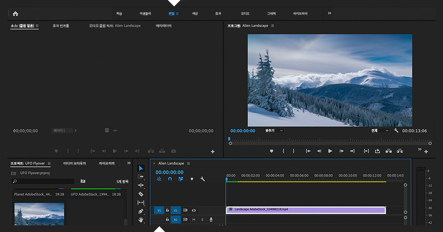 먼저 편집 작업 영역으로 전환하고 타임라인 패널 V1에 배경 푸티지를 배치하는 것으로 작업을 시작합니다. 예제 풍경샷에 포함된 광활한 하늘 영역을 창의력을 발휘할 수 있는 작업용 빈 캔버스 개념으로 생각하면 좋습니다.