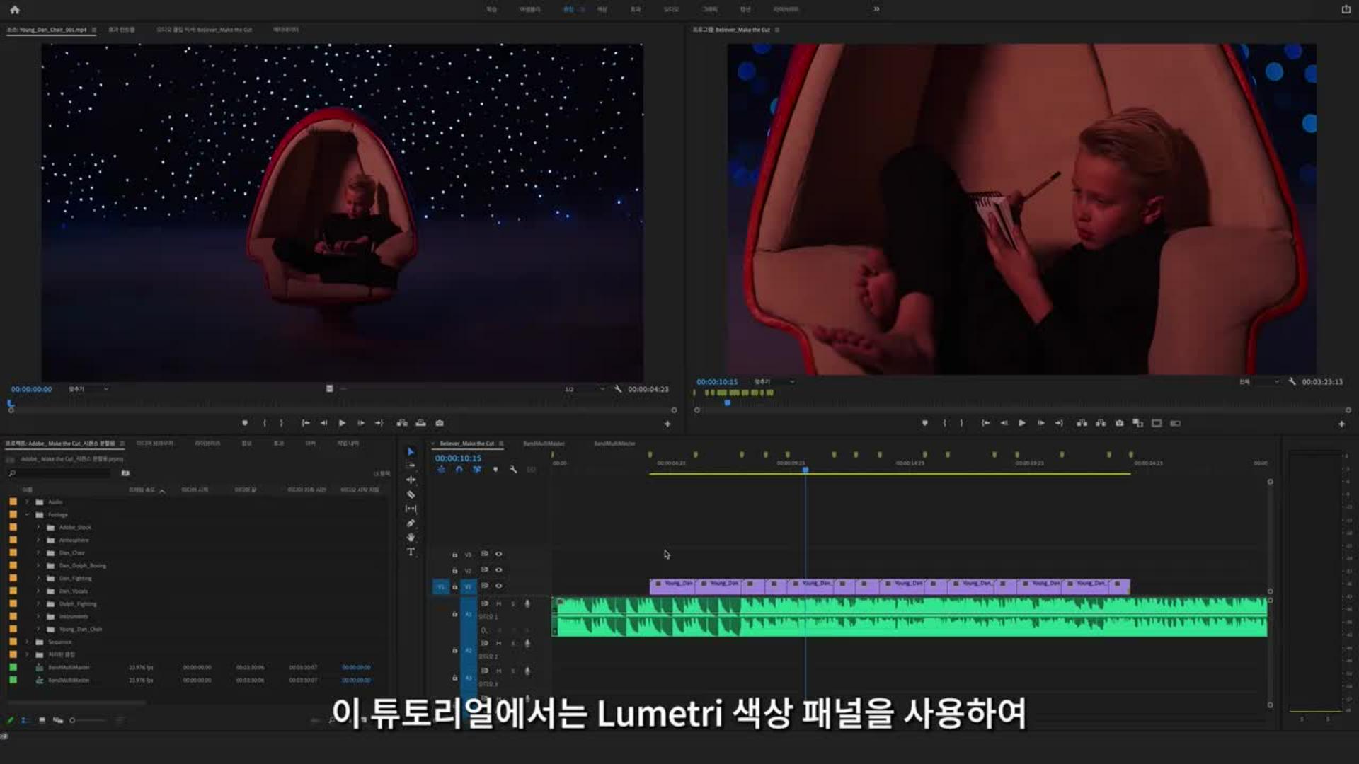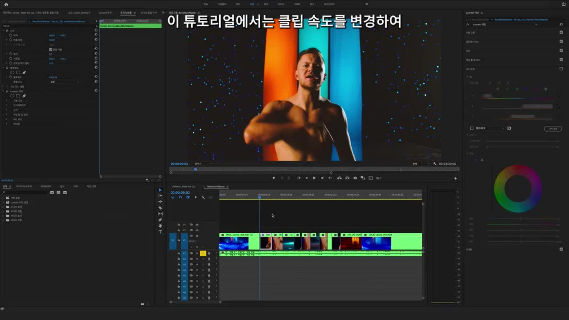 Lumetri 색상 패널에서 제공되는 크리에이티브 LUT, 곡선 등 다양한 컨트롤을 사용하여 톤을 교정하고 색상을 조정하며 뮤직비디오 룩에 스타일을 지정합니다.