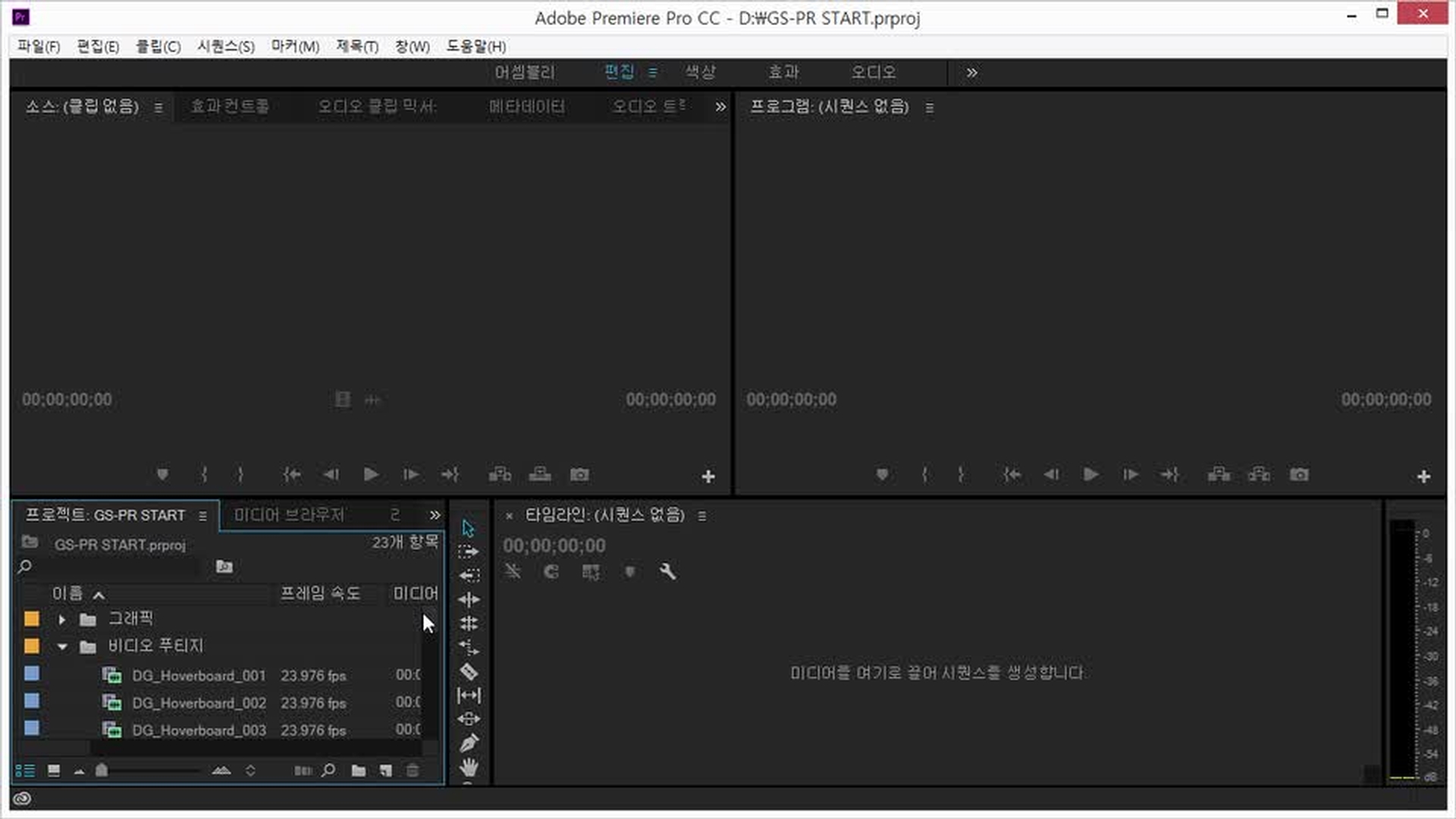 다양한 툴과 작업 영역 패널 간 이동하는 방법을 살펴봅니다. 컴퓨터에 있는 비디오를 가져오고 첫 번째 시퀀스를 만들어 봅니다.