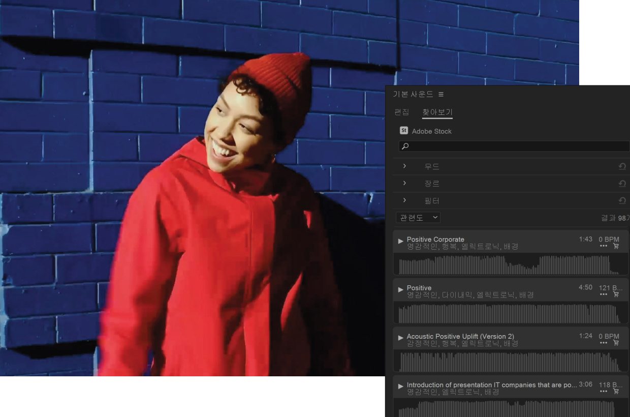 기본 사운드 패널에서 키워드, 무드 또는 장르별로 검색하여 Adobe Stock의 트랙을 찾습니다. 프로젝트에 먼저 추가하지 않고 트랙을 샘플링할 수 있습니다.