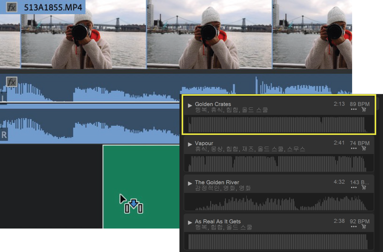 기본 사운드 패널에서 선택 항목을 타임라인의 오디오 트랙으로 드래그하여 프로젝트에 에셋을 추가합니다. 한 번의 클릭으로 오디오에 라이선스를 부여할 수 있습니다.