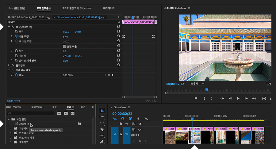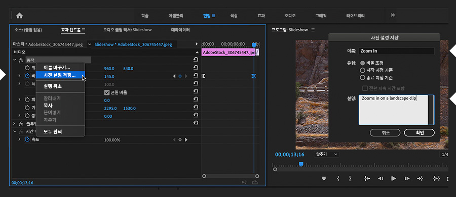 Adobe Premiere Pro에서 맞춤 동작 사전 설정을 사용하여 여러 스틸 이미지에 이동 및 확대/축소를 효율적으로 추가함으로써 슬라이드 쇼 제작에 걸리는 시간을 절약해 보세요.