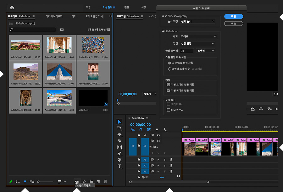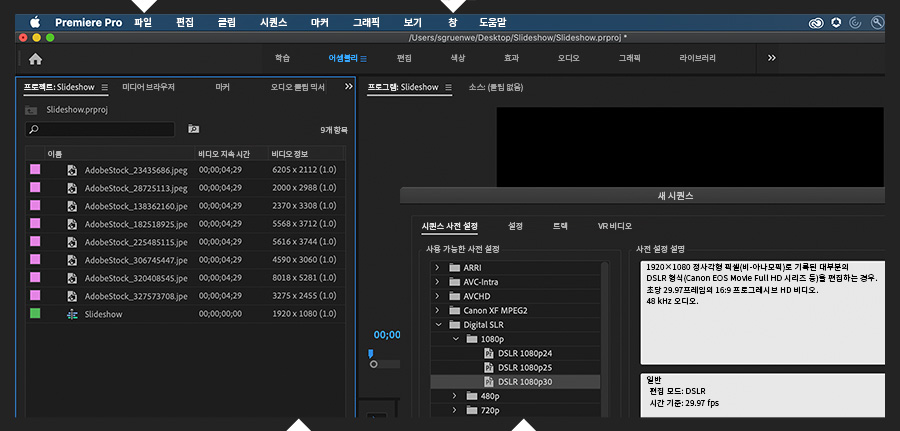먼저 어셈블리 작업 영역으로 전환하고(창 > 작업 영역 > 어셈블리) 슬라이드 쇼에 포함할 모든 사진을 가져옵니다(파일 > 가져오기). 파일 > 새로 만들기 > 시퀀스를 열고 새 시퀀스 대화 상자에서 Digital SLR 사전 설정을 선택합니다. 프로젝트 패널의 비디오 정보 열을 보면 사진의 해상도가 시퀀스보다 높을 가능성이 있으나, 이 문제는 나중에 해결할 수 있습니다.