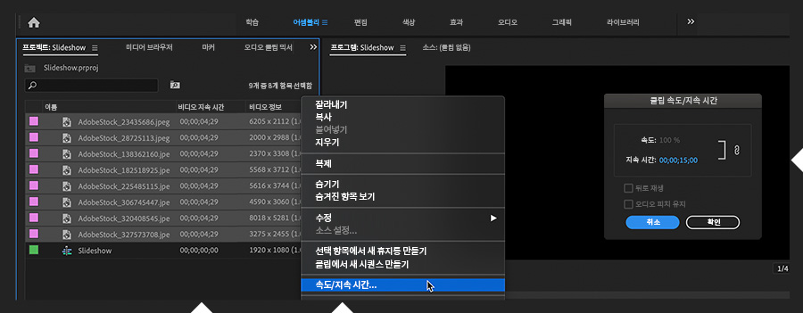 기본적으로 스틸 이미지는 Premiere Pro에서 5초 클립으로 나타납니다. 각 사진의 5초가 슬라이드 쇼에서 너무 빠르면 프로젝트 패널에서 모든 이미지를 선택하고 마우스 오른쪽 버튼으로 클릭한 다음 속도/지속 시간을 선택합니다. 클립 속도/지속 시간 대화 상자에서 이미지 지속 시간을 프로젝트에 적합한 길이로 설정합니다. 프로젝트에 따라 사색적이고 평온한 분위기에 맞게 느리게 할 수 있습니다.