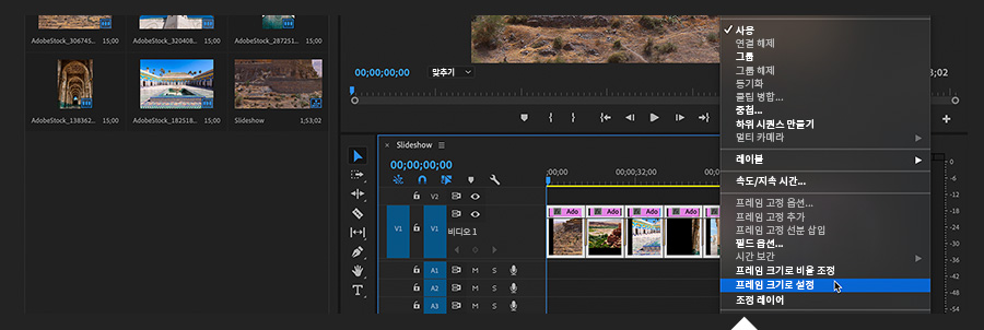 앞서 언급했듯이 이러한 사진은 시퀀스의 크기보다 대부분 더 큽니다. 타임라인 패널에서 모든 클립을 드래그하여 선택하고 마우스 오른쪽 버튼으로 클릭한 다음 '프레임 크기로 설정'을 선택합니다. 그러면 프레임 크기에 맞게 자동으로 맞춰지므로 이미지 품질 훼손 없이 추가로 크기를 조정할 수 있습니다.