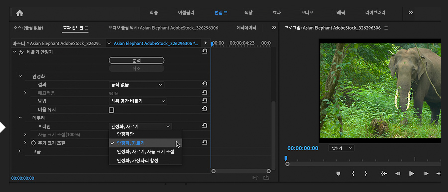 클립 안정화 기능을 잘 이해하기 위해 테두리 섹션의 프레임 옵션을 조정합니다. 기본적으로 확대 비율이 자동으로 높아져 안정화 효과의 가장자리가 가려집니다. 프레임을 안정화, 자르기로 설정하면 이미지 비율은 유지되지만 클립 주위에 검정 테두리가 표시됩니다. 안정화만 옵션은 장면을 안정화하기 위해 프레임의 필요한 움직임이 표시됩니다.