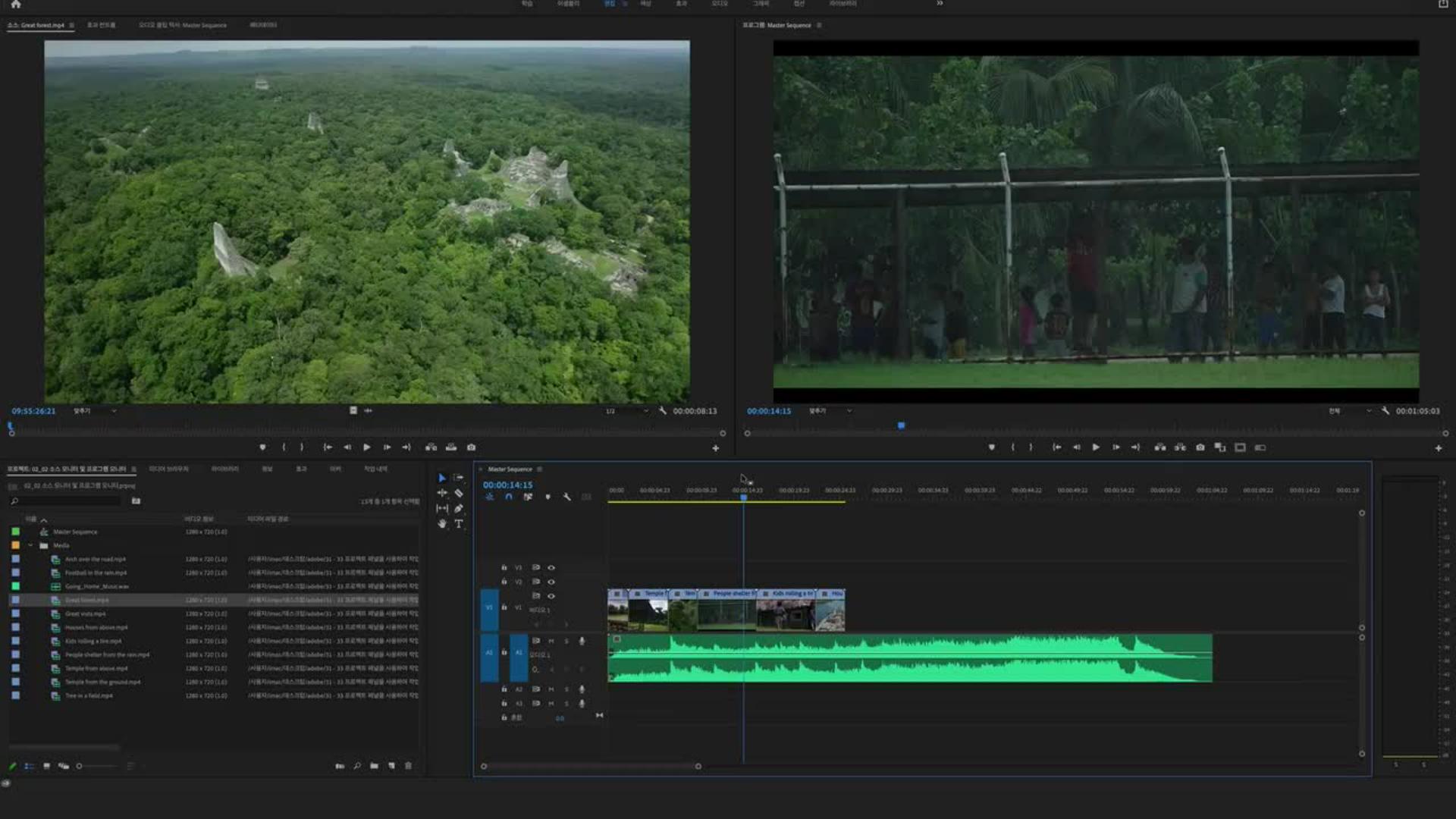 클립을 개별 비디오와 오디오 트랙에 배치할 수 있습니다. 비디오 트랙은 스택으로 재생되므로 프로그램 모니터에서 시퀀스를 재생할 때 위에 있는 비디오 트랙의 클립이 아래에 있는 비디오 트랙의 클립 앞에 표시됩니다. 오디오 트랙은 함께 재생되므로 여러 오디오 클립을 다른 트랙에 배치하여 사운드트랙 믹스를 만들 수 있습니다.
