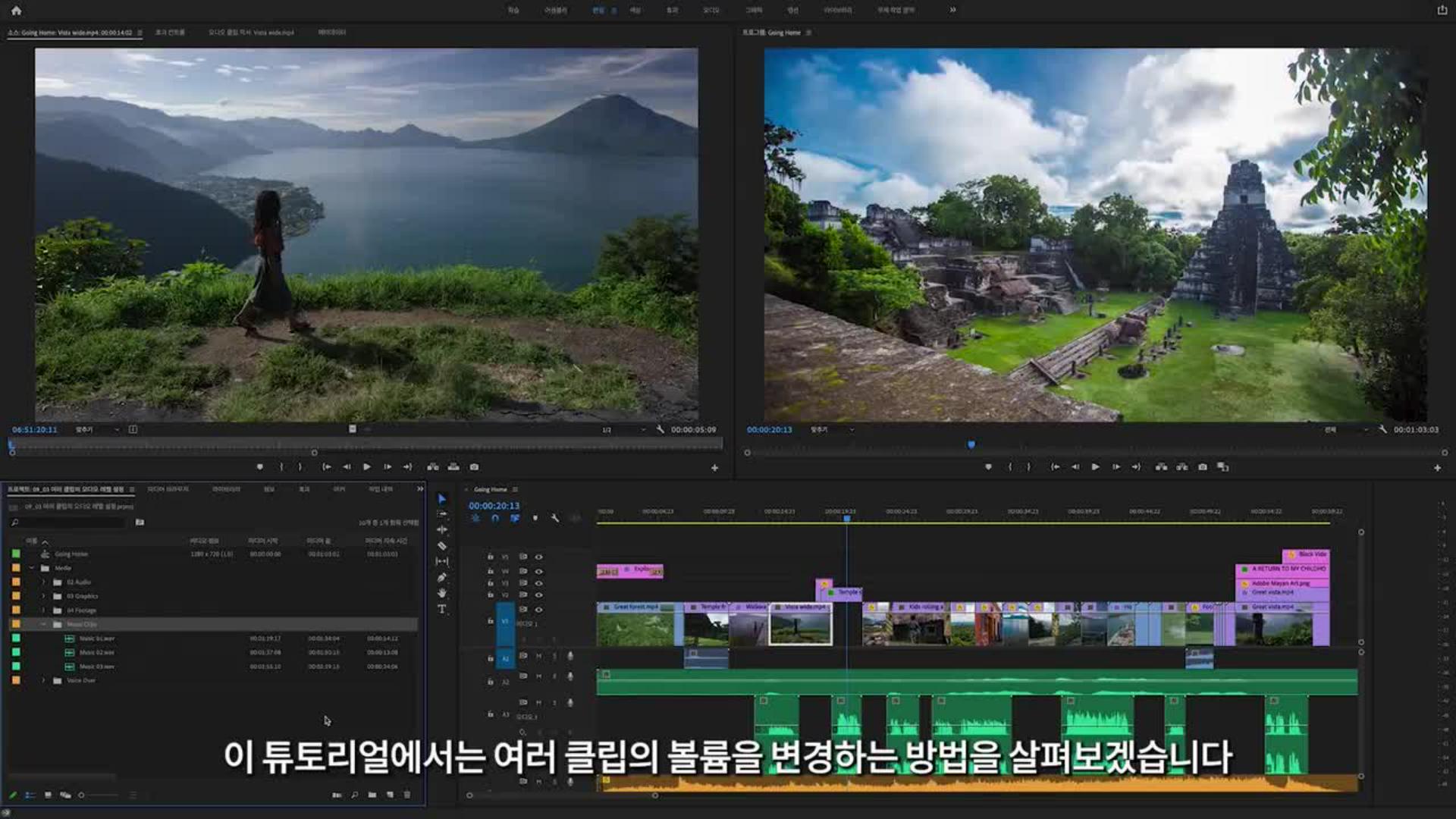 여러 클립의 볼륨을 동시에 변경하기 위한 두 가지 방법이 있습니다. 오디오 게인 조정(음악 클립에 유용)과 기본 사운드 패널(대화에 유용)의 두 가지 방식 모두 탁월하게 작동합니다.